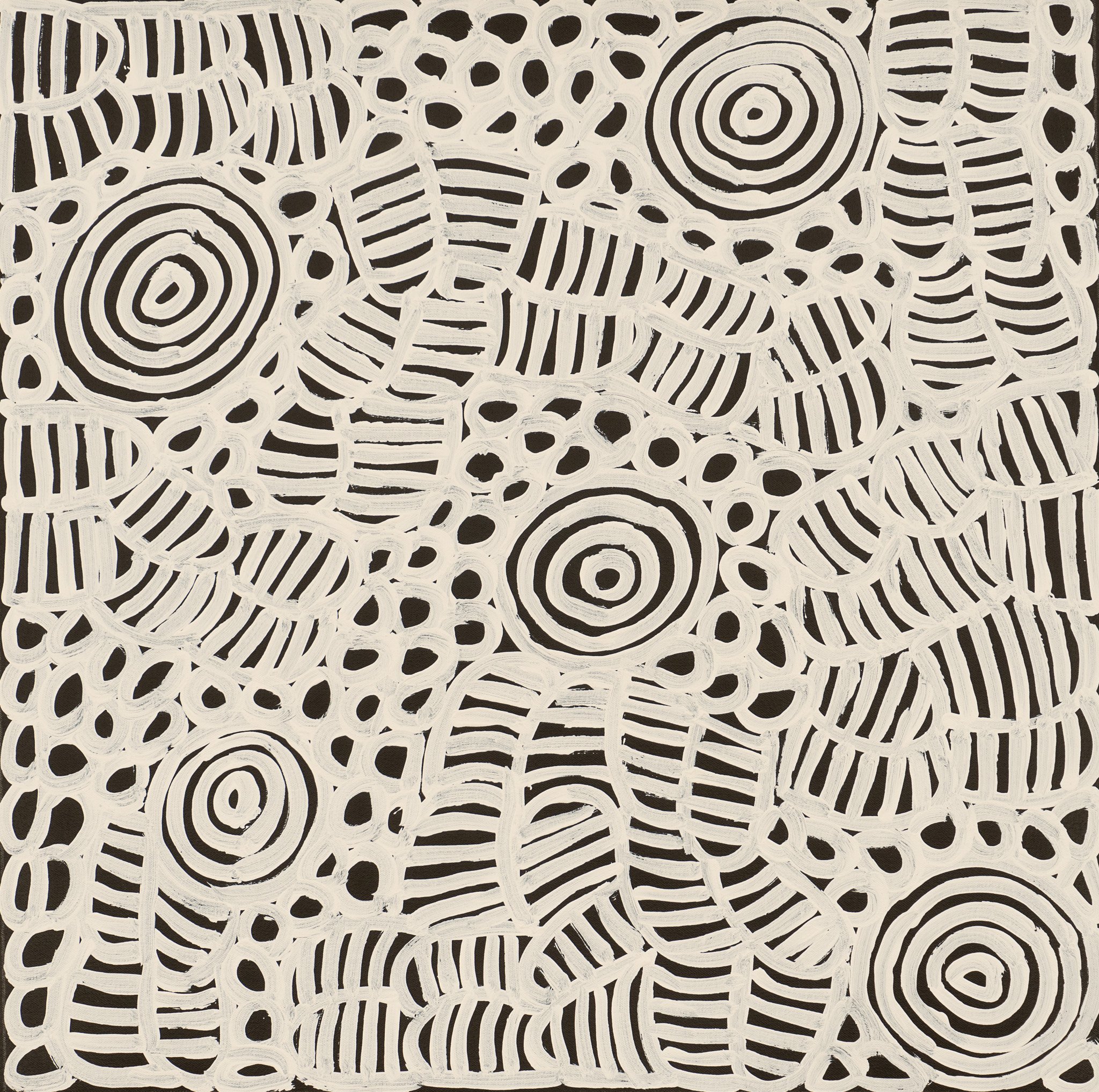 Dora has four children and resides in Alice Springs, returning to her homelands of Atnwengerrp with her family often. A quiet, traditional lady who continues to pay homage to her heritage by depicting the bush tucker, ceremonial body paint and water sources in her country.