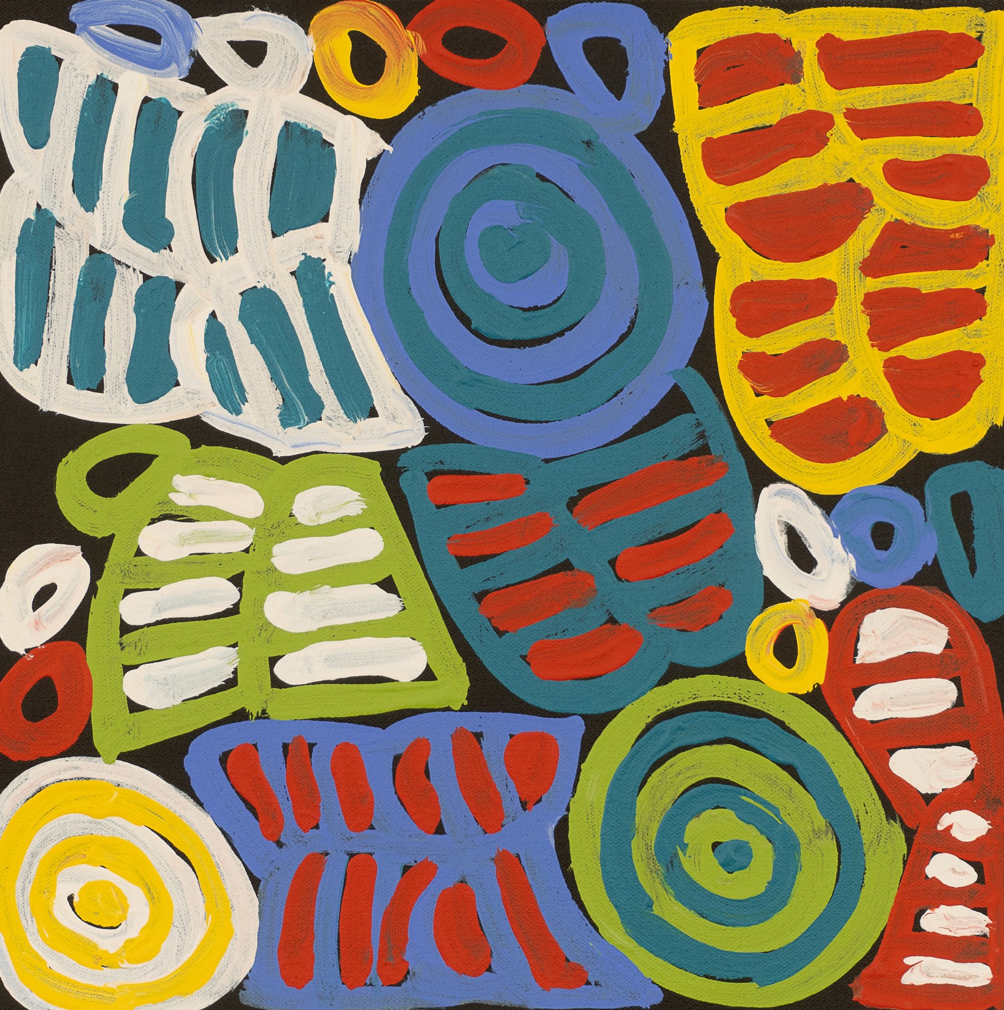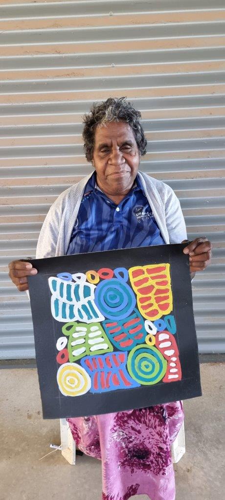 Dora paints the Body Paint (Awleye) designs, coupled with the small roundels of bush melons and large roundels (soakages) made famous by her mother, but stamping the artworks as her own with flair and recognisable signature strong brush strokes.