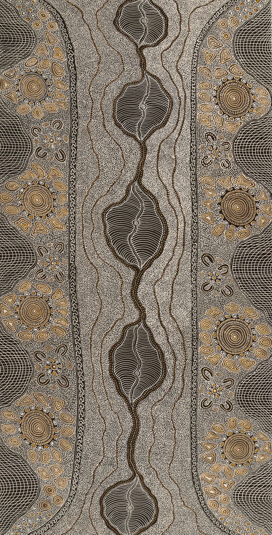 Her composition layers fine dot work and flowing lines to depict the sand hills, riverbeds, and significant ceremonial landmarks that hold deep cultural meaning. These sites are places where women gather for important cultural Law matters, including girls’ initiation ceremonies, ensuring the continuation of ancestral knowledge from older women to younger generations.