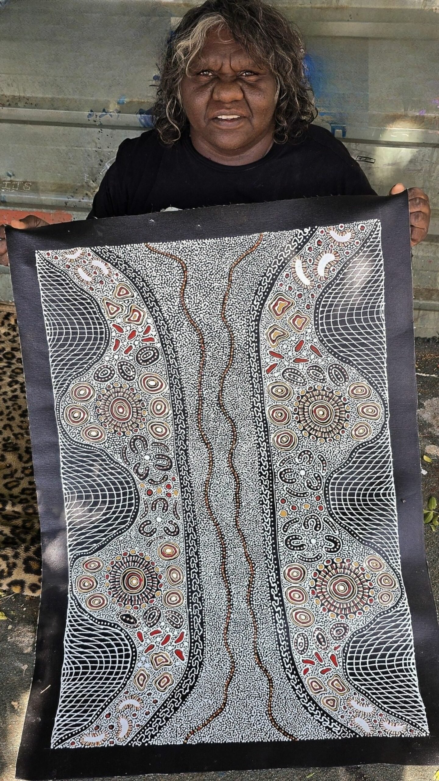 Her composition layers fine dot work and flowing lines to depict the sand hills, riverbeds, and significant ceremonial landmarks that hold deep cultural meaning. These sites are places where women gather for important cultural Law matters, including girls’ initiation ceremonies, ensuring the continuation of ancestral knowledge from older women to younger generations.