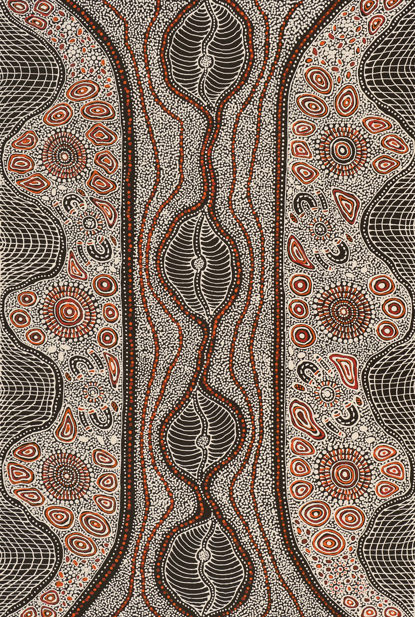In this intricately detailed work, Dulcie Long Pula presents a topographical view of her homelands in Utopia, Central Australia.