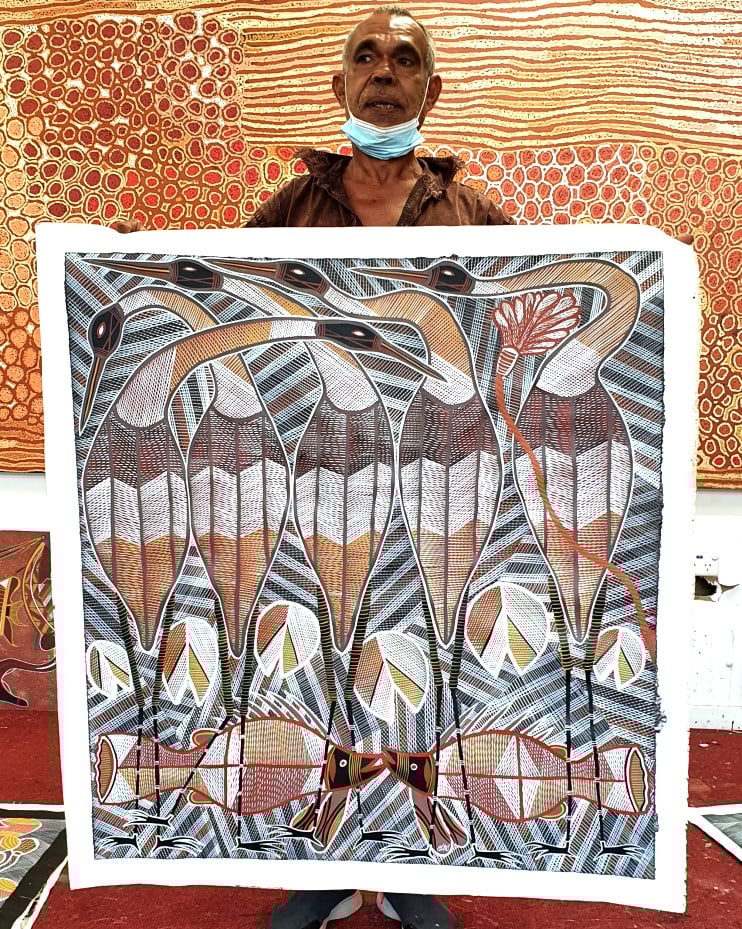 Eddie is from Naiyalrindji country on the Roper River, 270 km south-east of Katherine in the Northern Territory. It is now called the Yugul Mangl Community. Many good painters have emerged from that community and are represented in most major Australian and overseas galleries. His family are renowned artists and carvers. He is a great didgeridoo maker and his fine large bird carvings (some standing two meters high) are breathtaking.