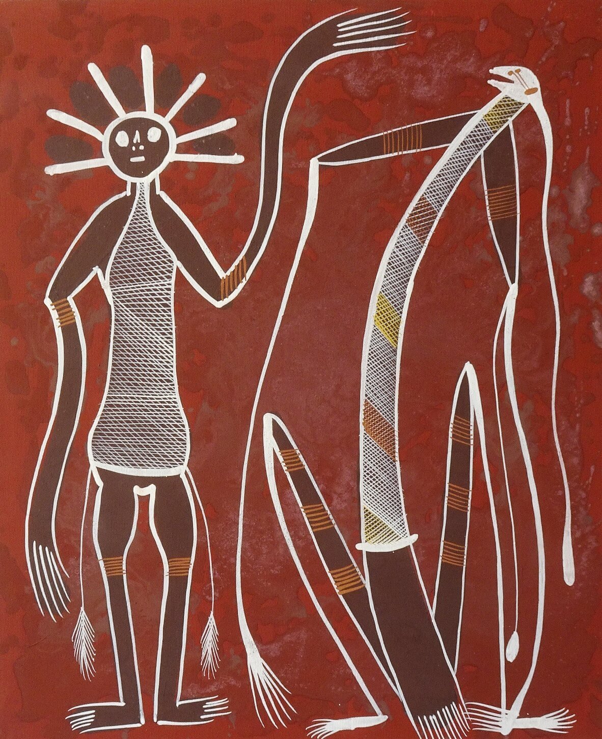Mimis are the tiny, match-thin spirits which Aborigines believe have lived in the escarpments since the beginning of time, and are still living there today. In the Dreamtime they taught many skills, including hunting, weaving, fishing, painting on rock and on bark, ceremonial songs and dances to old medicine men (marrkidjbu), who in turn passed their knowledge on to the elders of the tribe so that they could teach other chosen men. Without a written language, painting was the only way in which the history and religion of the tribe could be passed down, thereby ensuring that future generations would know of the deeds of the Ancestral Beings who walked the earth in the beginning of time.