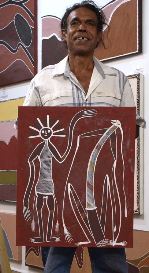 Eddie is from Naiyalrindji country on the Roper River, 270 km south-east of Katherine in the Northern Territory. It is now called the Yugul Mangl Community. Many good painters have emerged from that community and are represented in most major Australian and overseas galleries. His family are renowned artists and carvers. He is a great didgeridoo maker and his fine large bird carvings (some standing two meters high) are breathtaking.