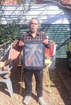 Eddie commenced painting when he was seven – from a very early age, he used to watch his grandfathers, Fred, Gerry and Donald, and the other Elders who taught him to blend ochre, apply the paint, carve, and passed on to him the stories of the work they were doing. Other members of his clan (Barbil) taught him how to make flint spear heads, traditional hunting boomerangs and most importantly how to hunt, fish, find bush tucker and make bush medicine to survive.