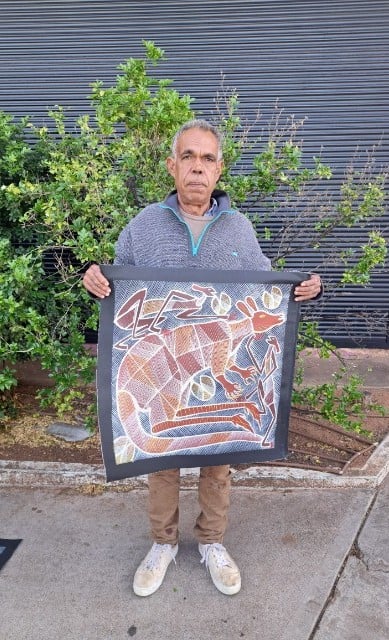 Eddie commenced painting when he was seven – from a very early age, he used to watch his grandfathers, Fred, Gerry and Donald, and the other Elders who taught him to blend ochre, apply the paint, carve, and passed on to him the stories of the work they were doing. Other members of his clan (Barbil) taught him how to make flint spear heads, traditional hunting boomerangs and most importantly how to hunt, fish, find bush tucker and make bush medicine to survive.