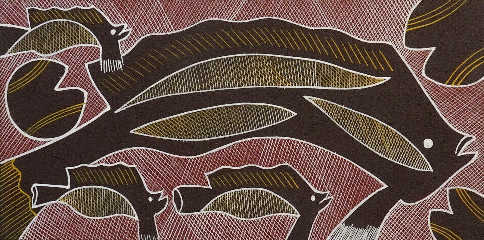Eddie commenced painting when he was seven – from a very early age, he used to watch his grandfathers, Fred, Gerry and Donald, and the other Elders who taught him to blend ochre, apply the paint, carve, and passed on to him the stories of the work they were doing. Other members of his clan (Barbil) taught him how to make flint spear heads, traditional hunting boomerangs and most importantly how to hunt, fish, find bush tucker and make bush medicine to survive.