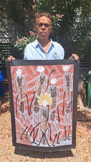 Eddie commenced painting when he was seven – from a very early age, he used to watch his grandfathers, Fred, Gerry and Donald, and the other Elders who taught him to blend ochre, apply the paint, carve, and passed on to him the stories of the work they were doing. Other members of his clan (Barbil) taught him how to make flint spear heads, traditional hunting boomerangs and most importantly how to hunt, fish, find bush tucker and make bush medicine to survive.