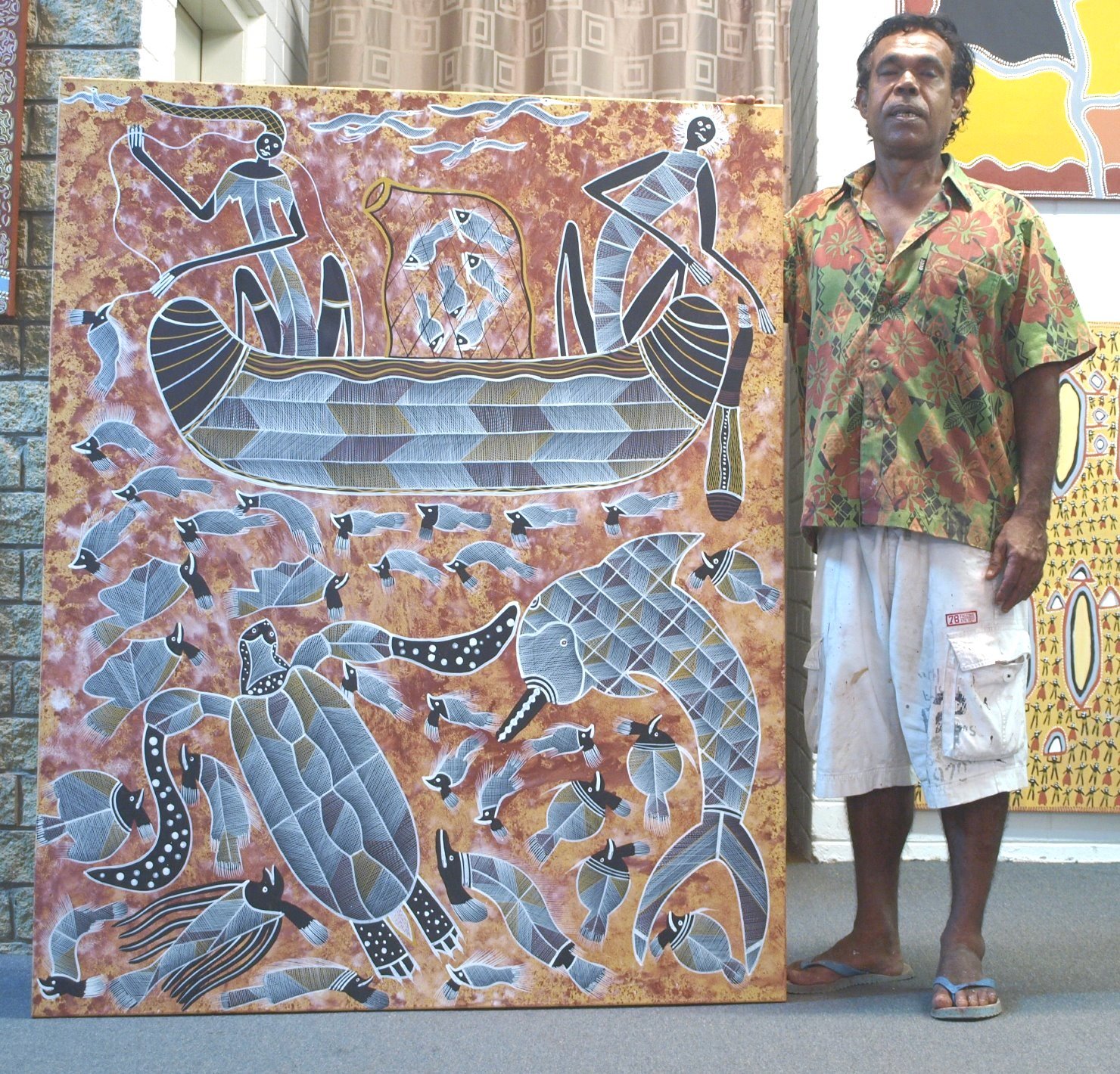 Eddie commenced painting when he was seven – from a very early age, he used to watch his grandfathers, Fred, Gerry and Donald, and the other Elders who taught him to blend ochre, apply the paint, carve, and passed on to him the stories of the work they were doing. Other members of his clan (Barbil) taught him how to make flint spear heads, traditional hunting boomerangs and most importantly how to hunt, fish, find bush tucker and make bush medicine to survive.