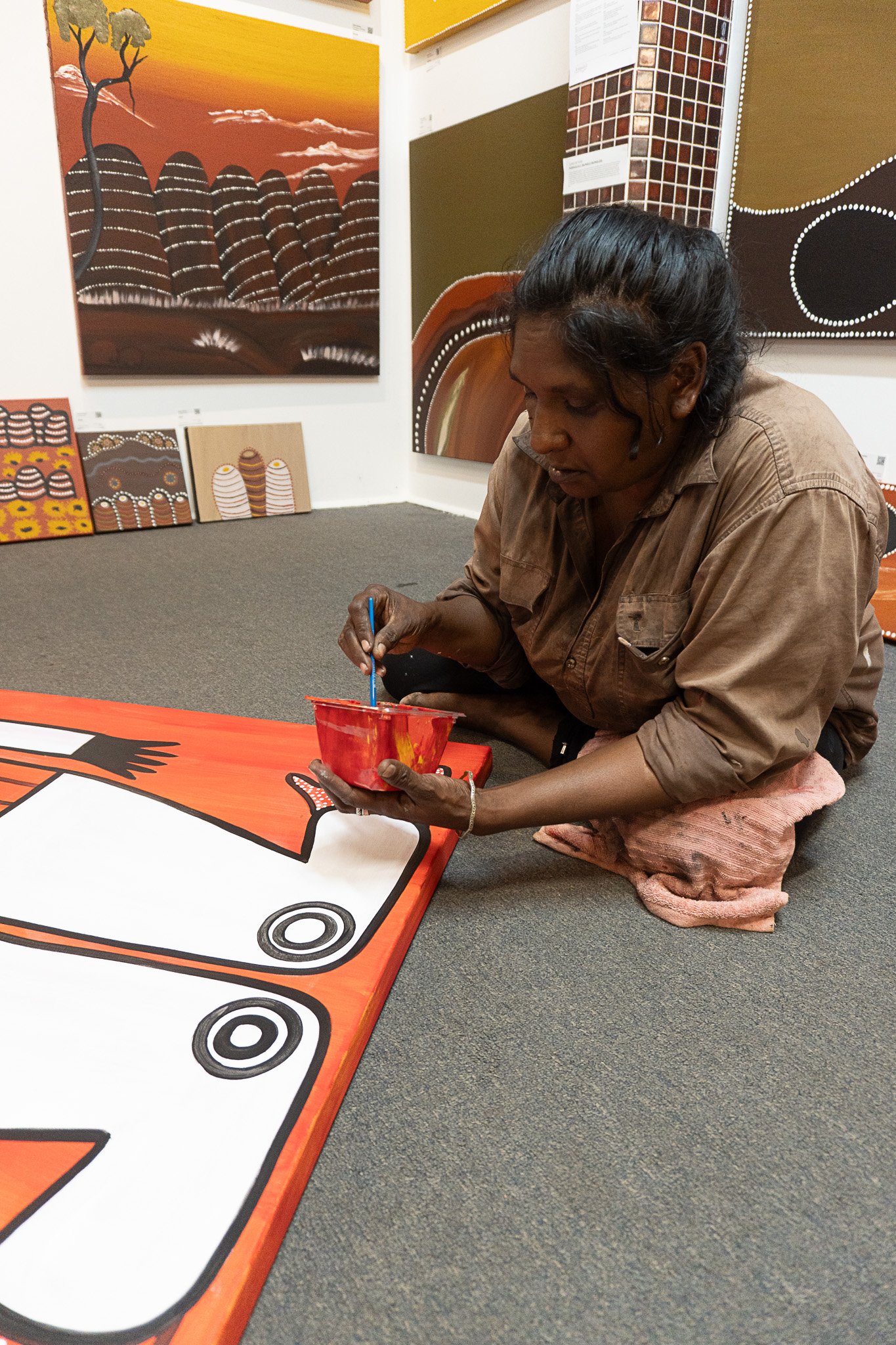 A lovely quietly spoken lady, Edna still lives on her traditional land and is the driving force behind encouraging other Ngarinyin people to use art to tell their stories and keep their culture strong. Her eldest daughter Petrina, also an artist, is carrying on this important tradition to a third generation.