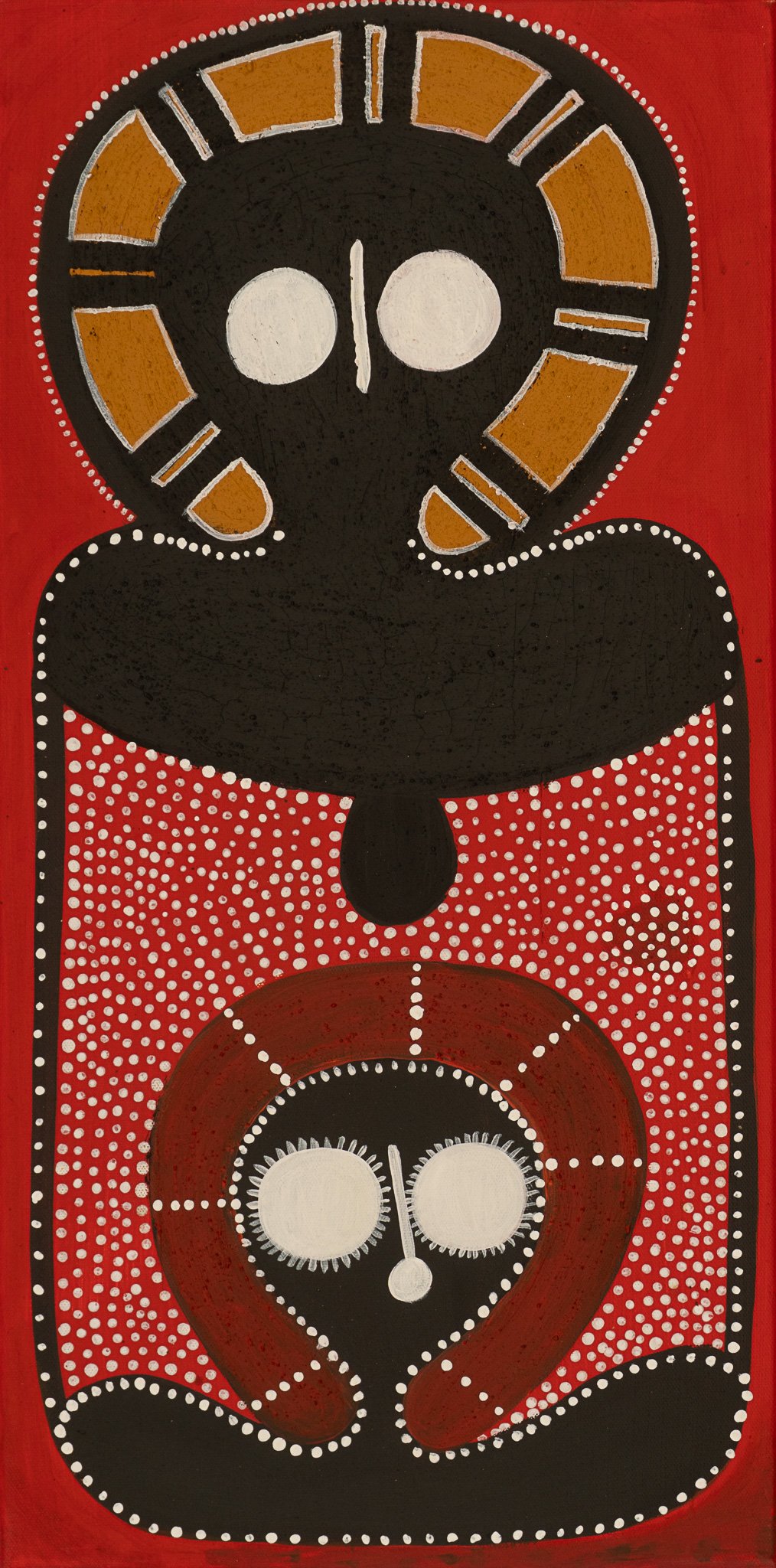 This stunning ochre painting by Edna Dale and her daughter Petrina Bedford Dale depicts the Wandjina — the ancestral creator spirit of the Kimberley. The Wandjina made the land, animals, people, and Dreamtime stories. He is the lawgiver and Rainmaker, bringing the wet season storms that renew Country.