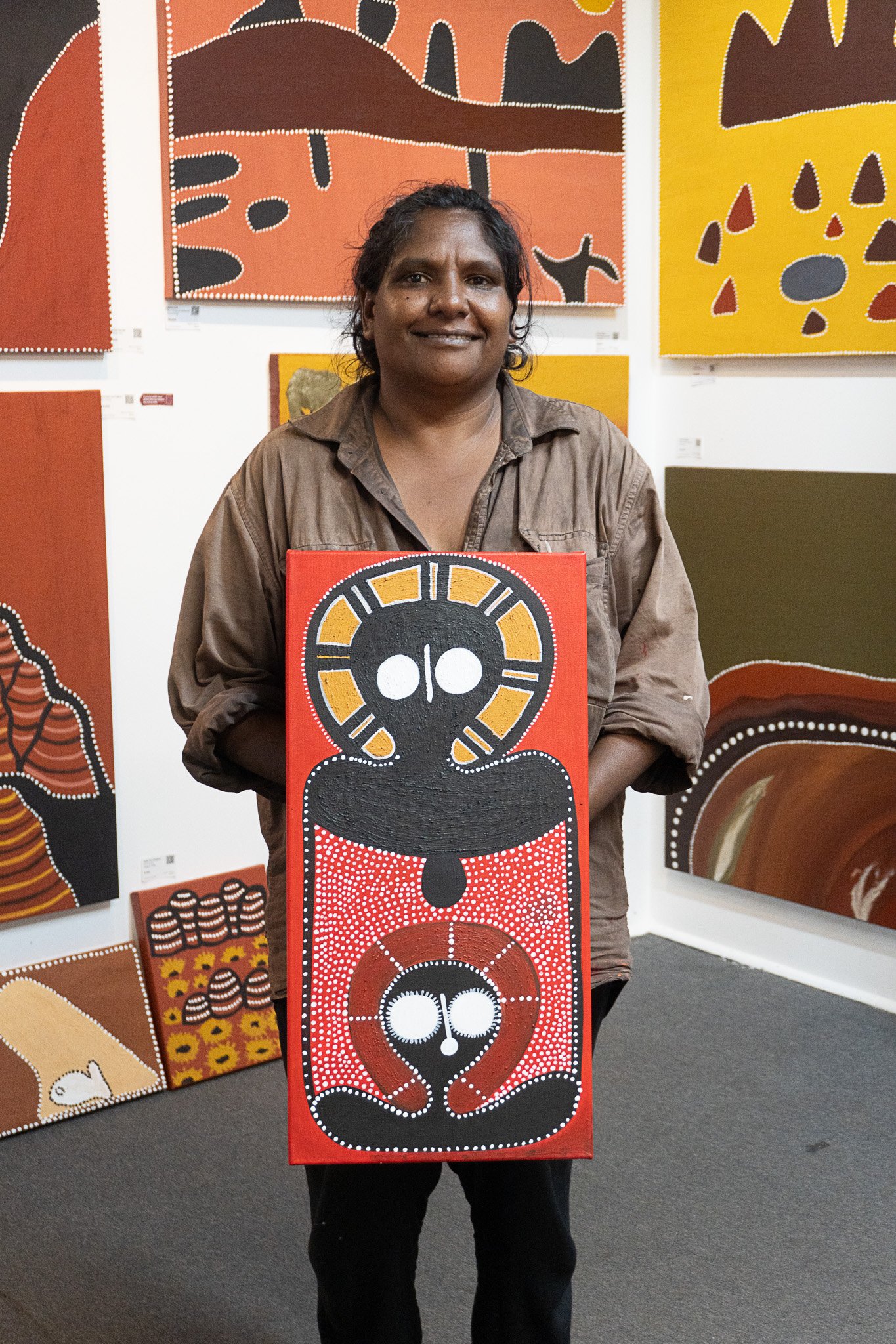 A lovely quietly spoken lady, Edna still lives on her traditional land and is the driving force behind encouraging other Ngarinyin people to use art to tell their stories and keep their culture strong. Her eldest daughter Petrina, also an artist, is carrying on this important tradition to a third generation.