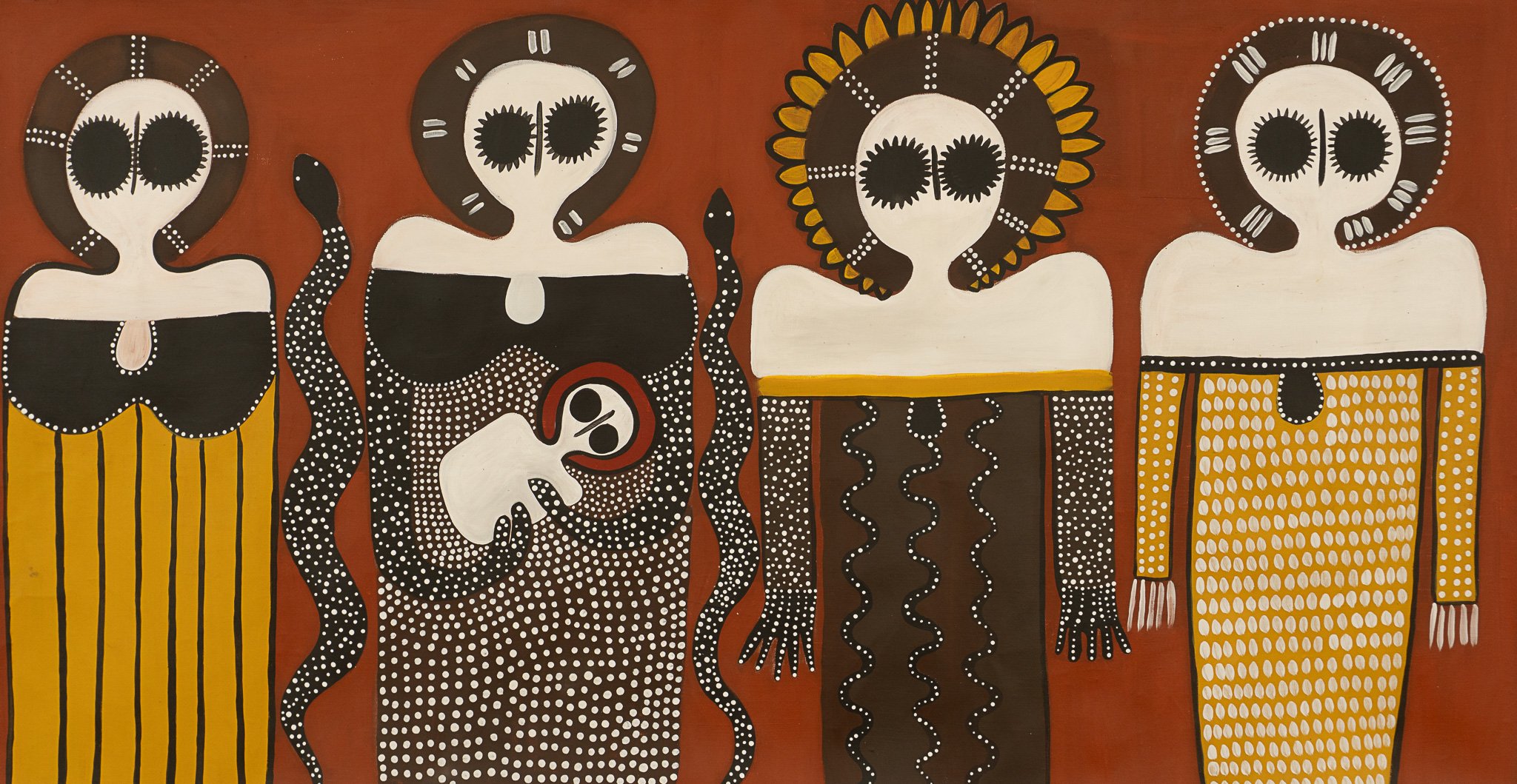 At the heart of this piece is the celebration of new life. The small Wandjina cradled in the second figure’s arms represents the birth of Petrina’s first child — a baby girl. The snakes that weave through the composition are not just decorative; they represent the child’s Ungud — her spiritual totem. The Snake, powerful and protective, was gifted to her through dreams, a deeply significant part of Ngarinyin culture.