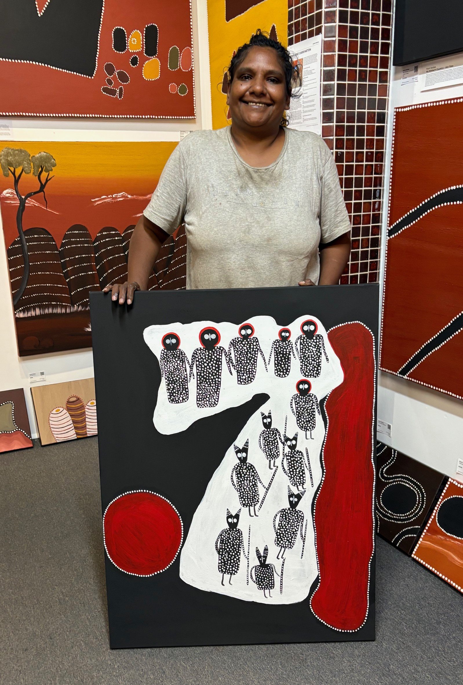 A lovely quietly spoken lady, Edna still lives on her traditional land and is the driving force behind encouraging other Ngarinyin people to use art to tell their stories and keep their culture strong. Her eldest daughter Petrina, also an artist, is carrying on this important tradition to a third generation.