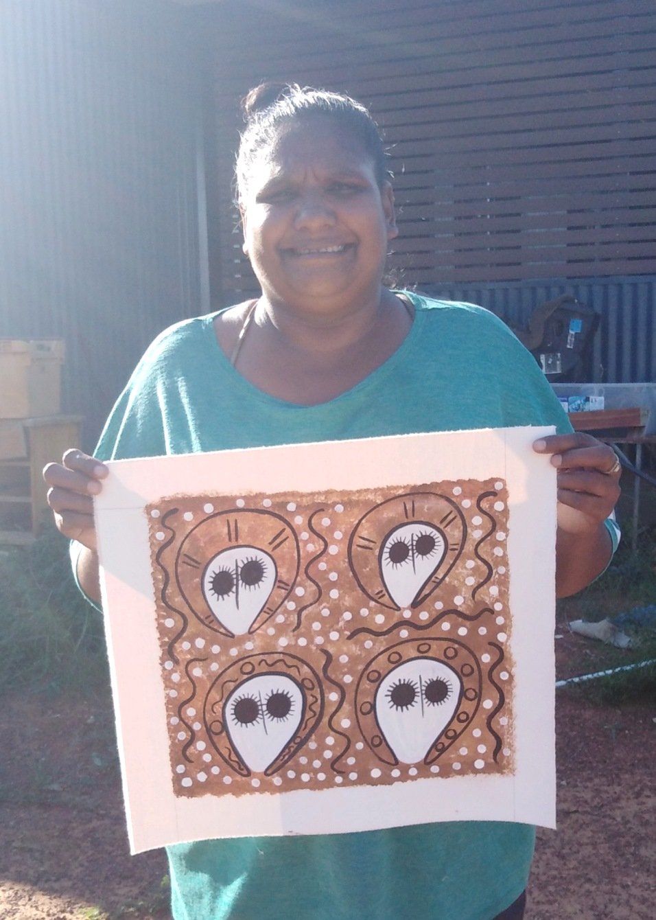A lovely quietly spoken lady, Edna still lives on her traditional land and is the driving force behind encouraging other Ngarinyin people to use art to tell their stories and keep their culture strong. Her eldest daughter Petrina, also an artist, is carrying on this important tradition to a third generation.