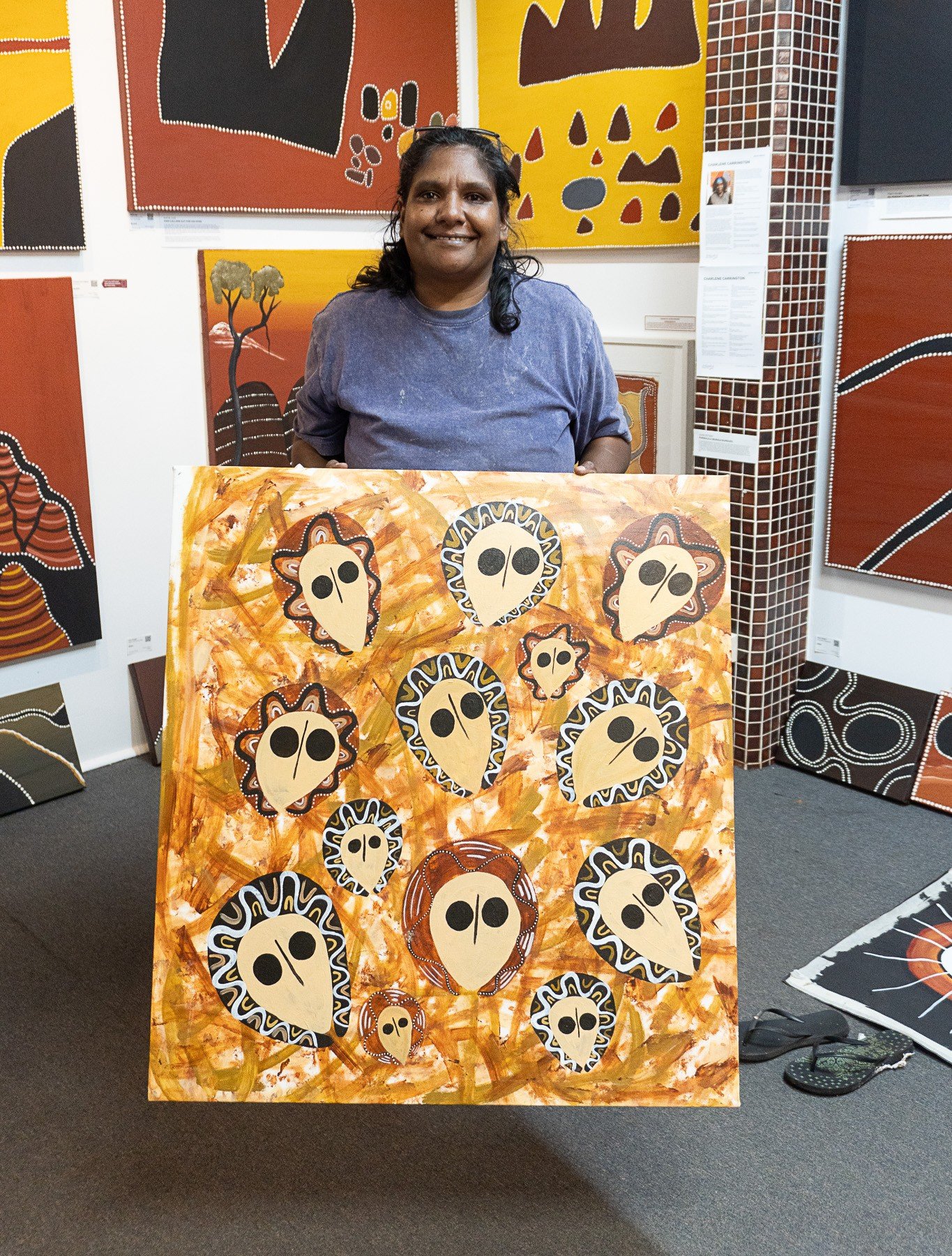 A lovely quietly spoken lady, Edna still lives on her traditional land and is the driving force behind encouraging other Ngarinyin people to use art to tell their stories and keep their culture strong. Her eldest daughter Petrina, also an artist, is carrying on this important tradition to a third generation.