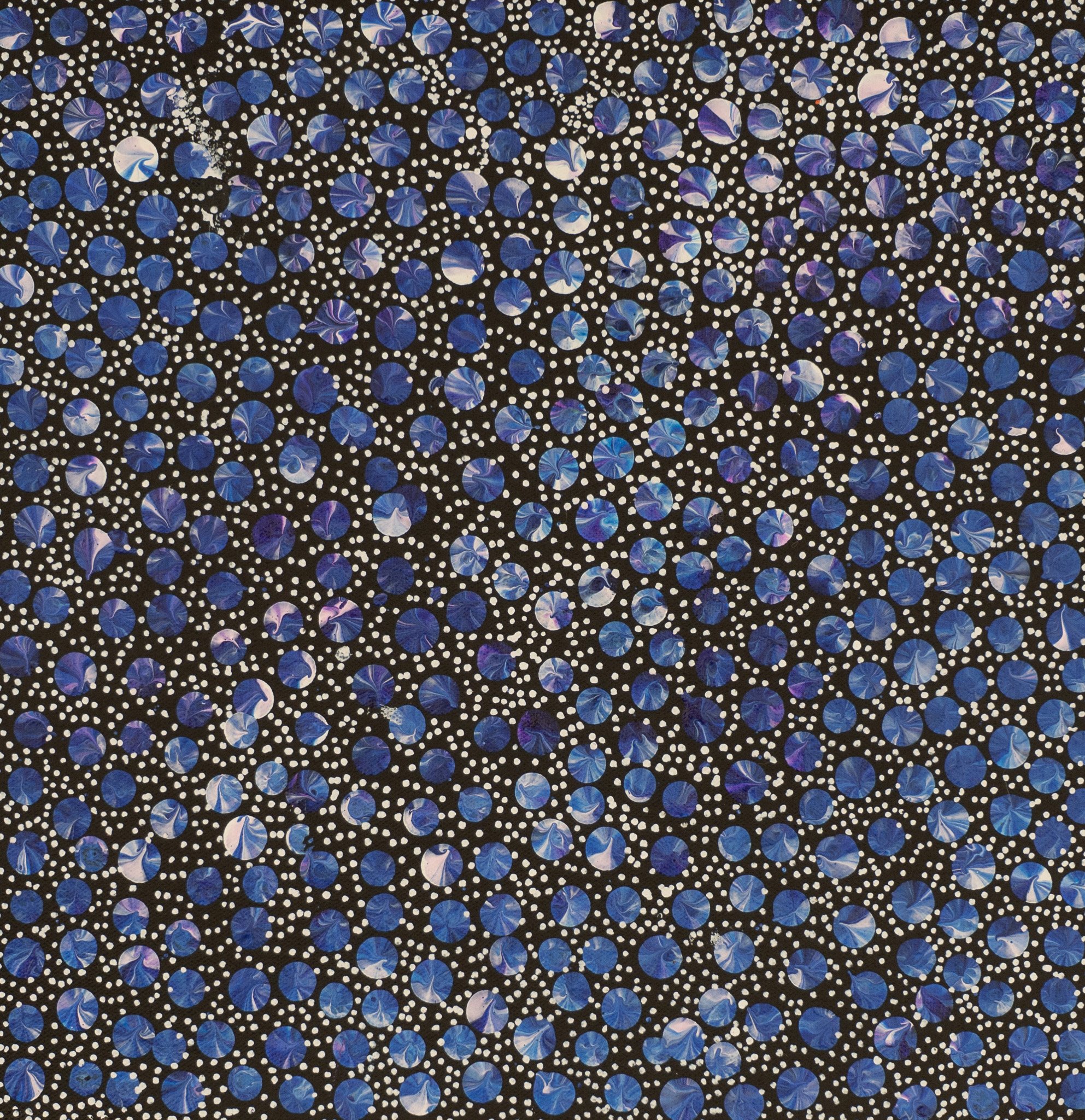 Eileen paints the Desert Yam (or Pencil Yam / Bush Potato) story. This yam grows underground with its viny shrub growing above ground up to one metre high. It is normally found on Spinifex sand plains and produces large colourful flowers after summer rain. The yam is a tuber, or swollen root, of the shrub and tastes much like the common sweet potato. It can be eaten raw or cooked and is still a staple food for the desert aborigines where it can be harvested at any time of the year. It is also renowned for its medicinal properties. This medicine is used to heal cuts, wounds, bites, rashes and as an insect repellent. In this painting, Eileen depicts the seed of the yam (dot work) and its flower (brush work) paying homage to the spirit of this special plant in the hope that it will regenerate.