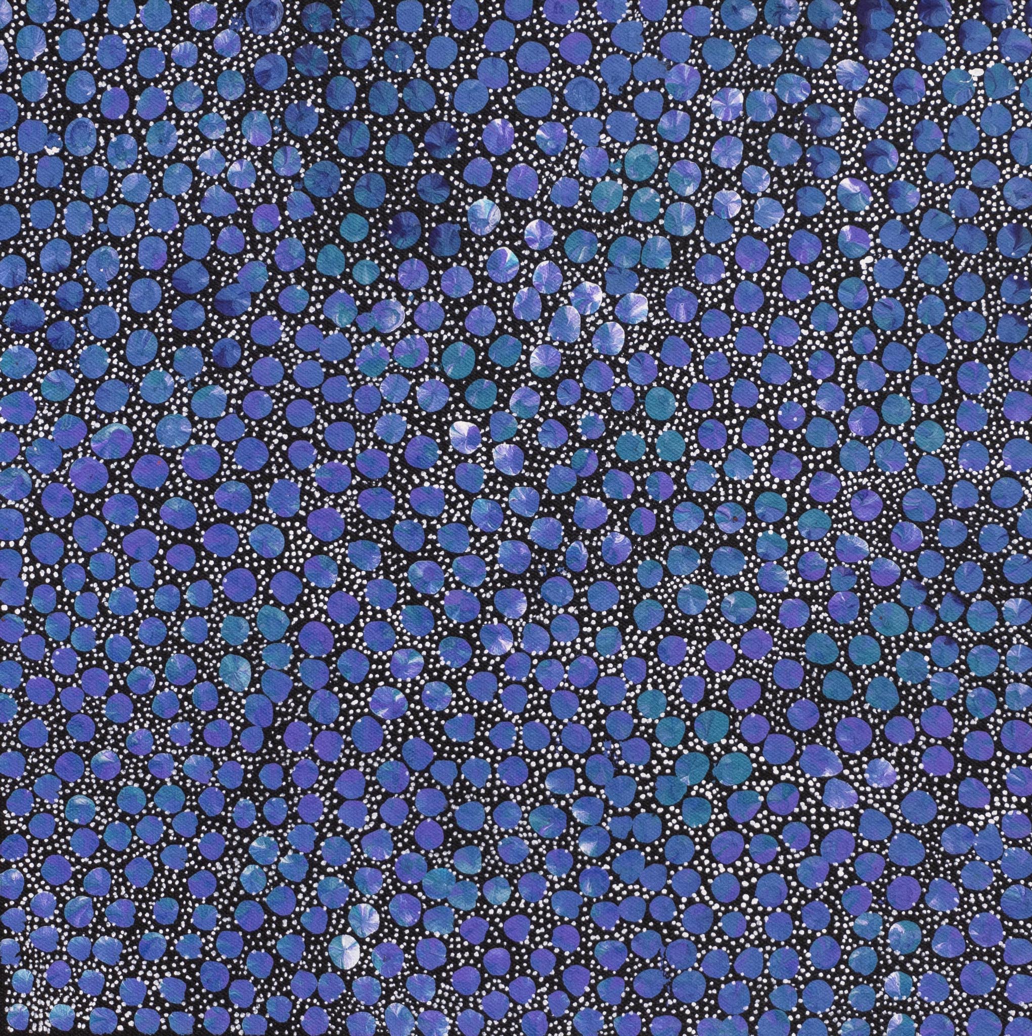 Eileen paints the Desert Yam (or Pencil Yam / Bush Potato) story. This yam grows underground with its viny shrub growing above ground up to one metre high. It is normally found on Spinifex sand plains and produces large colourful flowers after summer rain. The yam is a tuber, or swollen root, of the shrub and tastes much like the common sweet potato. It can be eaten raw or cooked and is still a staple food for the desert aborigines where it can be harvested at any time of the year. It is also renowned for its medicinal properties. This medicine is used to heal cuts, wounds, bites, rashes and as an insect repellent. In this painting, Eileen depicts the seed of the yam (dot work) and its flower (brush work) paying homage to the spirit of this special plant in the hope that it will regenerate.