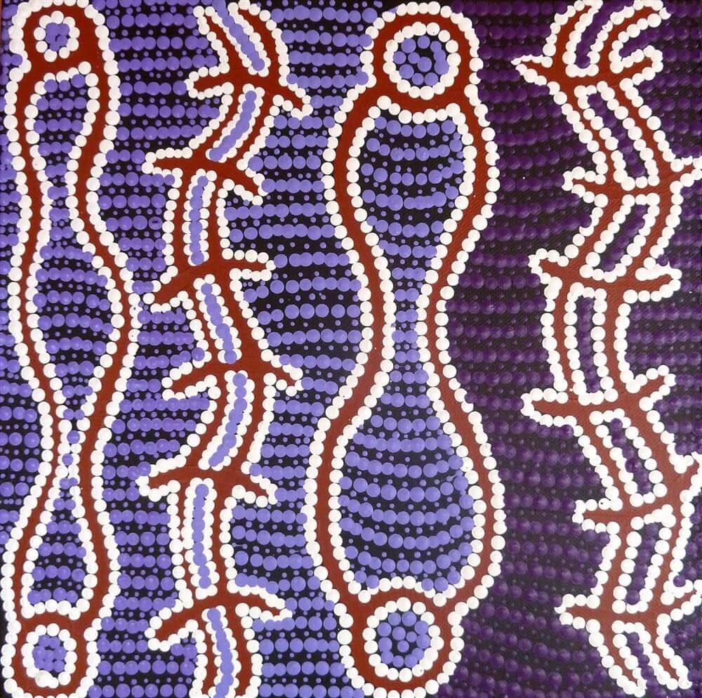 Felicity paints at the art centre and at home. At home, she likes to tell her grandchildren her Dreaming while she paints. She paints her Ngapa Jukurrpa (Water Dreaming) and Watiyawarnu Jukurrpa (Seed Dreaming) stories, stories passed down to her from her father and his father’s father before him. These stories are creation stories that relate to Felicity’s family’s traditional country, traditions that stretch back at least fifty millennia.