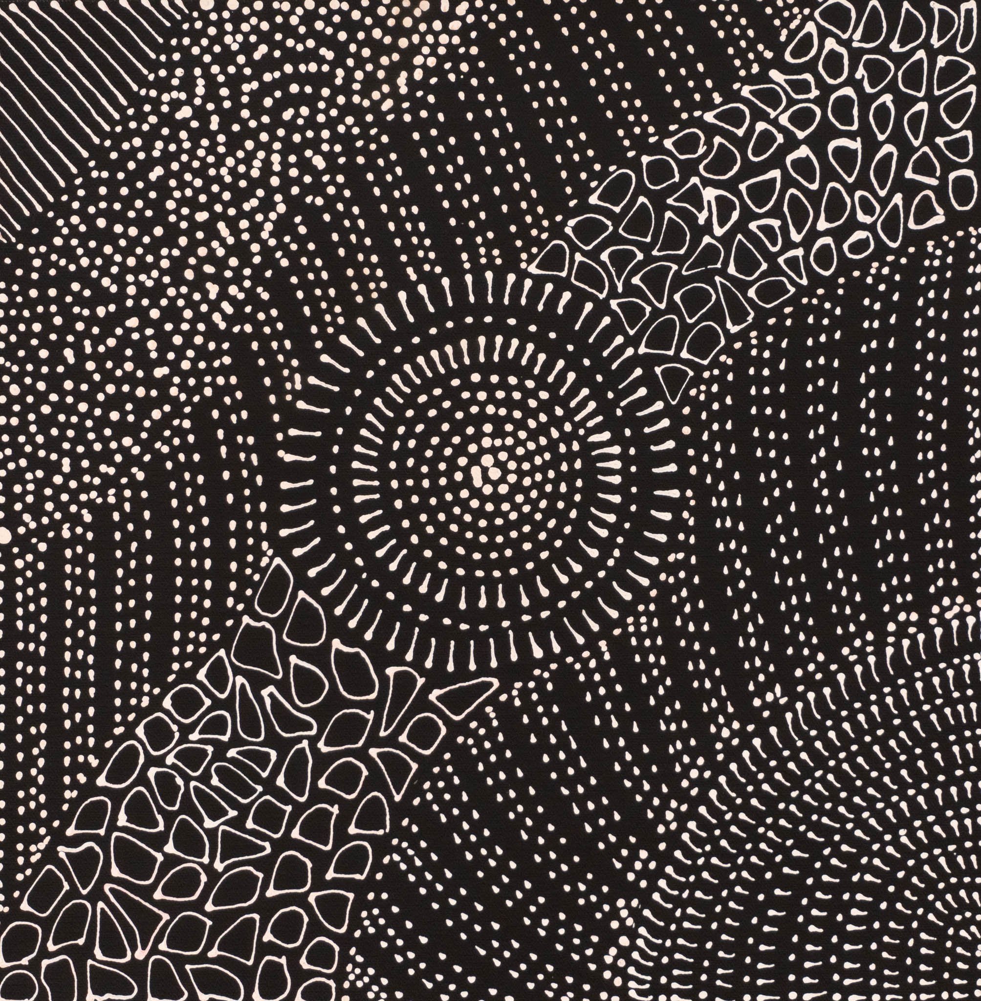 Freda’s artwork depicts from a topographical view in fine detail associated with her family homelands of Utopia in Central Australia. The illustration is important visually and spiritually of country – sand hills, river beds, and significant landmarks for ceremonies. The leaves, flowers, bark or seeds of certain plants are harvested in season or as needed. This is often done in groups so that knowledge is passed down from older to younger women. Ceremonial sites are where the women gather for girls’ initiation and other cultural Law matters. The women sit around the waterholes, often depicted in the artwork, with the waterholes being full in the dry desert land. Due to this, there was plenty of bush tucker around for the women to eat during the sometimes very long period of time they camped out for Women’s Business.