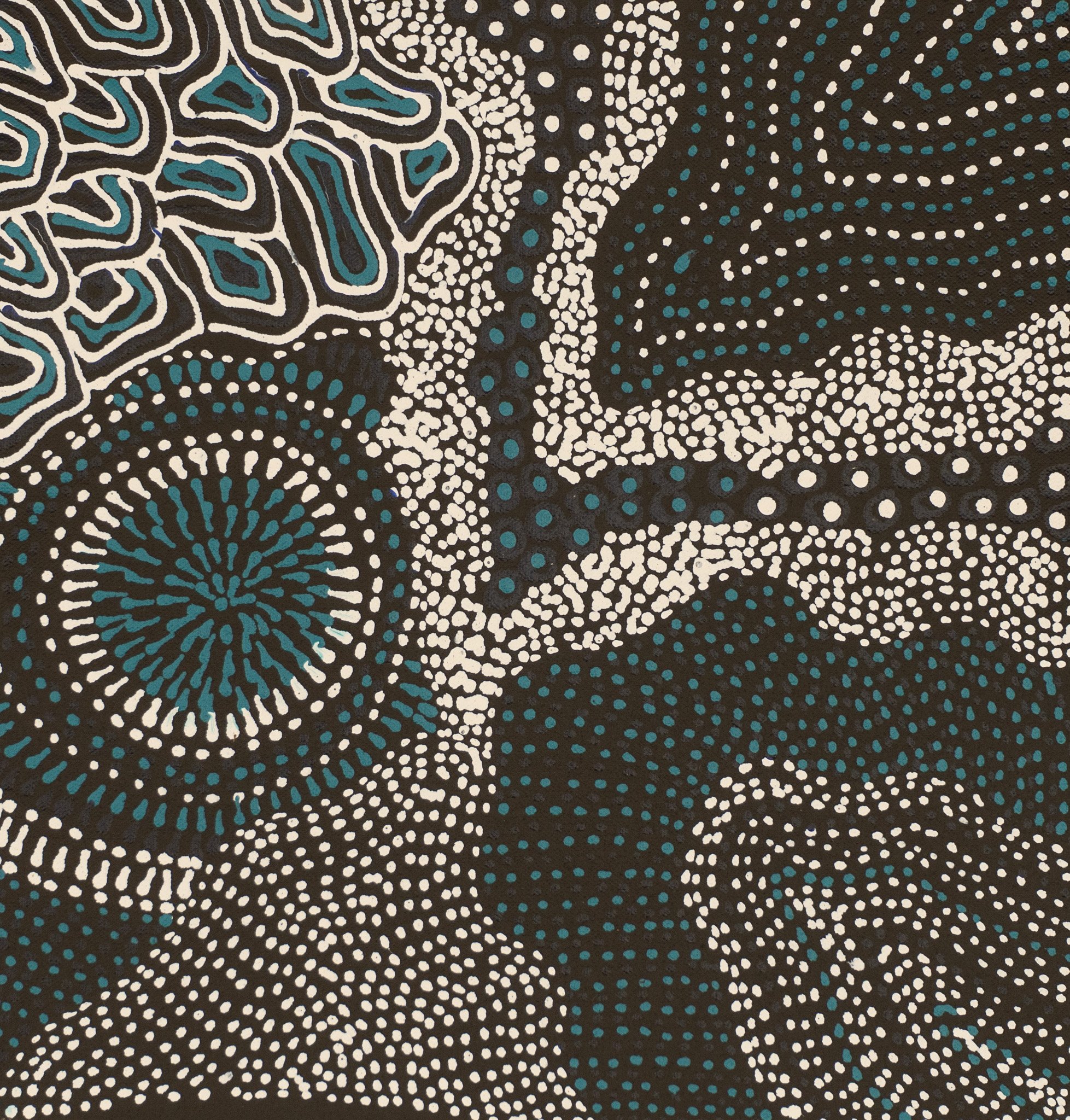 Freda’s artwork depicts from a topographical view in fine detail associated with her family homelands of Utopia in Central Australia. The illustration is important visually and spiritually of country – sand hills, river beds, and significant landmarks for ceremonies. The leaves, flowers, bark or seeds of certain plants are harvested in season or as needed. This is often done in groups so that knowledge is passed down from older to younger women. Ceremonial sites are where the women gather for girls’ initiation and other cultural Law matters. The women sit around the waterholes, often depicted in the artwork, with the waterholes being full in the dry desert land. Due to this, there was plenty of bush tucker around for the women to eat during the sometimes very long period of time they camped out for Women’s Business.
