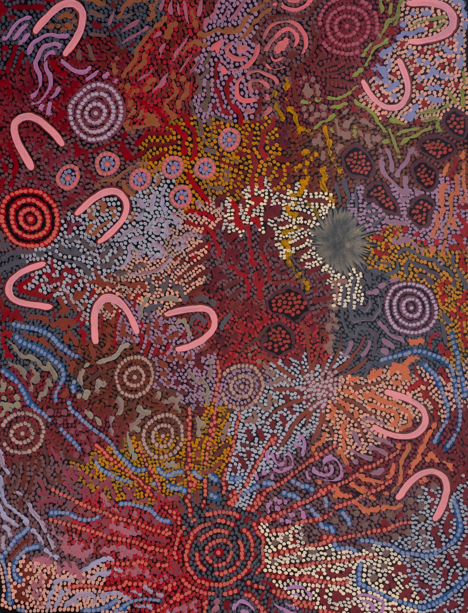 Represented as symbolic U-shapes, the women are shown in different areas collecting wild growing bush food, which is given form through star-like shapes that represent berry bushes, while clusters of encased small dots and large dots serve to represent various types of berries and bush plums that the women collect. The red fire-like motif represents the women’s campfire and ceremonial site where the women gather for ceremony and engage in ritual song and dance and create body art and sand paintings, which the concentric circles in this work depict and double to act as specific sites where bush food is in plenty. Rain nourishes the desert and is captured through the white dotted motifs , which also serves to double as pipe-clay used as paint in the ritual life of Yuelamu`s women, who follow their Ancestral Grandmother’s example in her home country, which is the subject of this work.