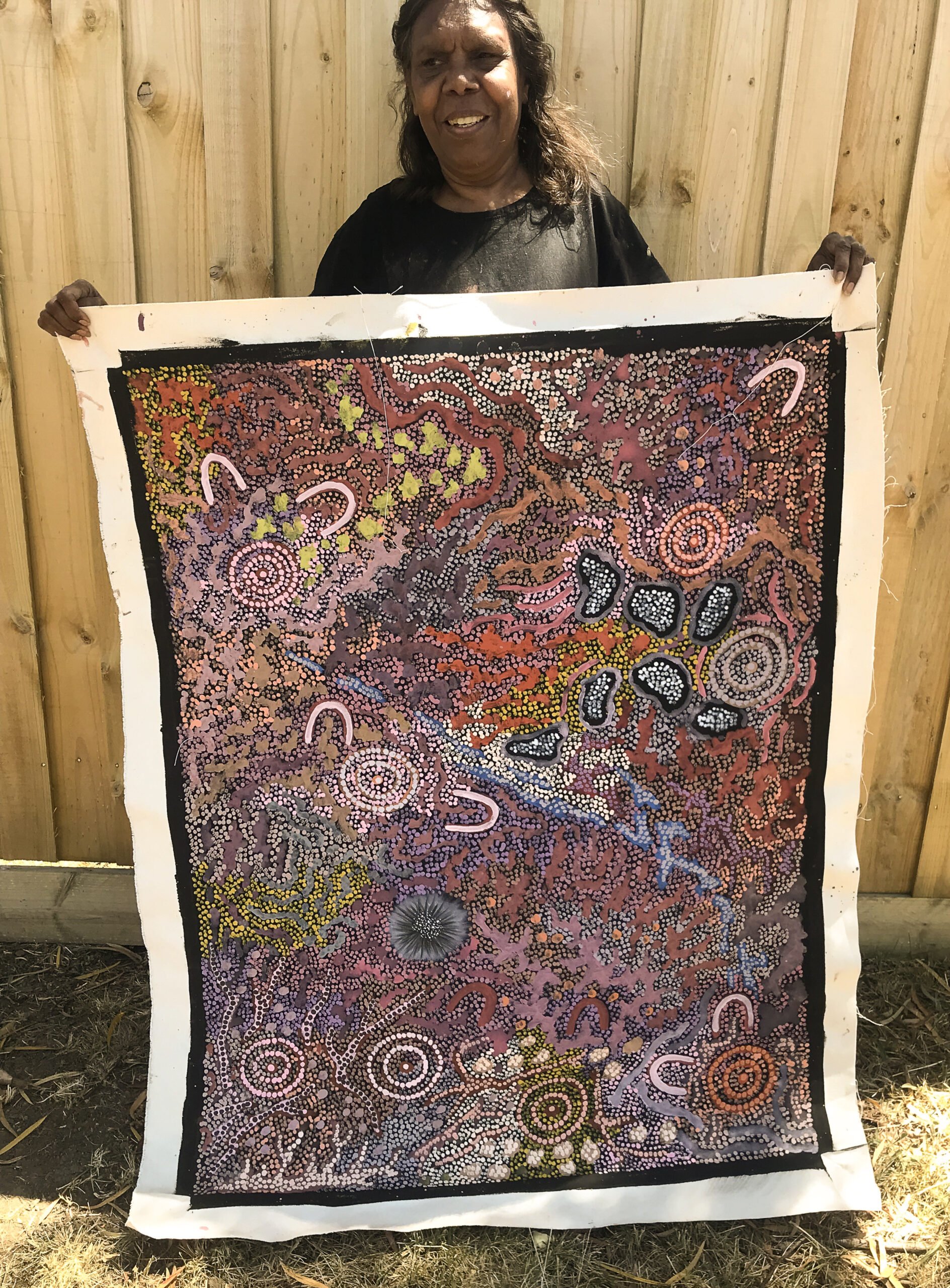 She was the youngest artist to be awarded the prestigious Alice Springs Art Prize whilst still studying at Yirara College at age 16. Her natural talent and knowledge of the women’s dreaming stories was enhanced technically by her association with the grass roots painters of Papunya Tula – her father’s brother Tim Leura Tjapaltjarri, Long Jack Phillipus, Johnny Warrankgula Tjupurula, and many others.