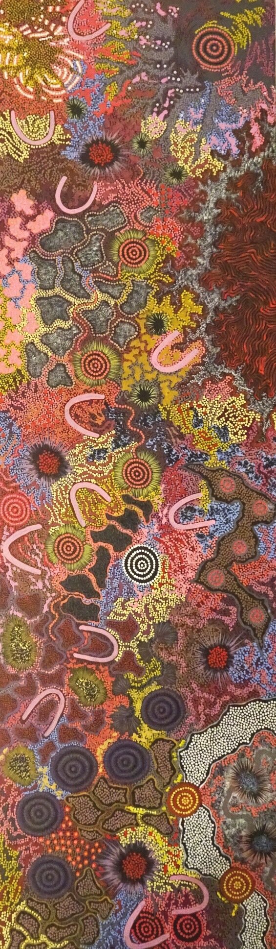 In this painting the artist depicts motifs that give symbolic form to tribal women engaged in cultural activities in a desert environment known as Yuelamu, which the women inherited from their Ancestral Grandmother, who travelled to this Anmatyerre site in the Tanami Desert during the Dreamtime, at Creation.