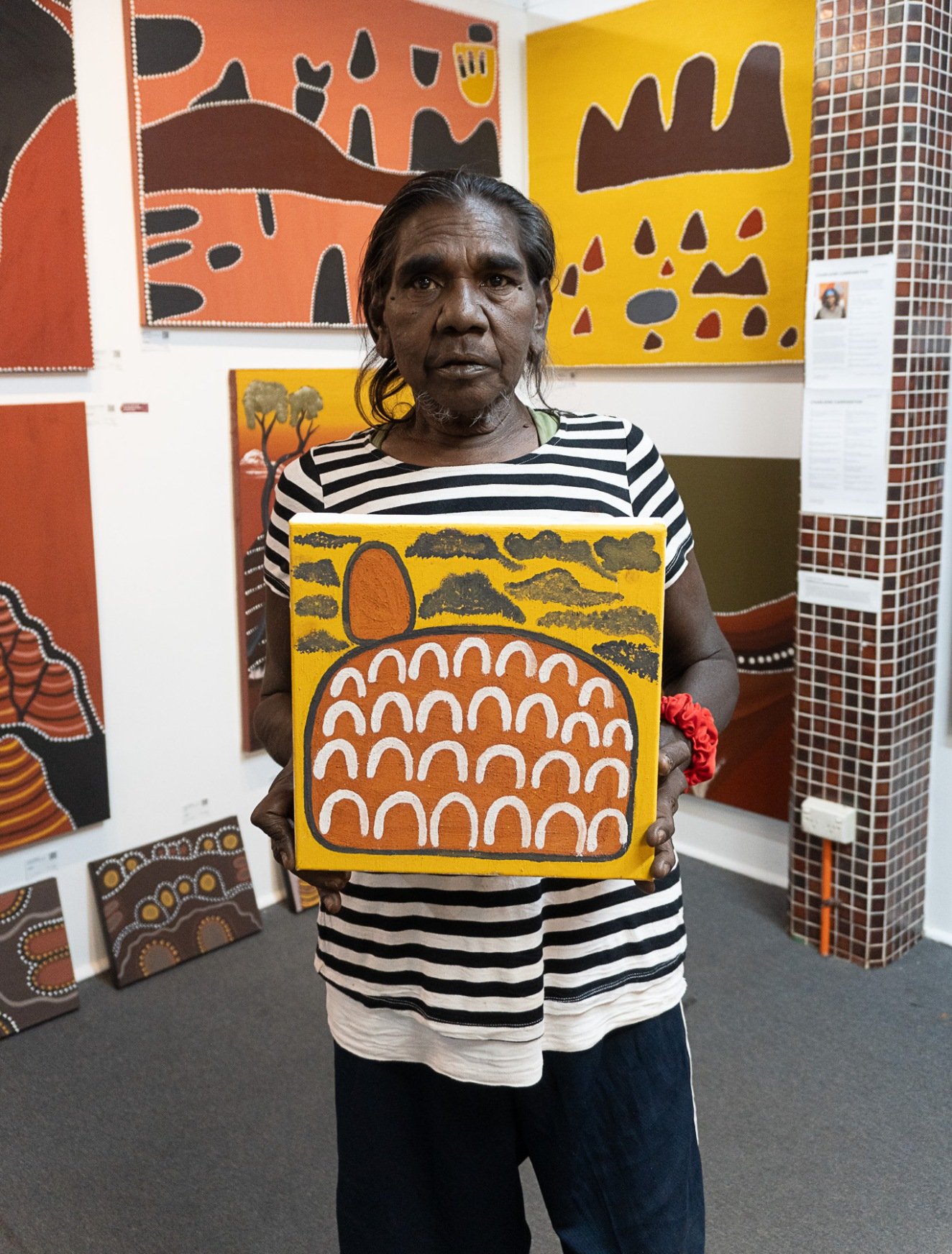 “Somebody have to keep on carrying my painting,” Lena told her. Geraldine paints with permission from her relatives and with a strong sense of purpose: to honour her cultural inheritance, stay connected to her Country, and ensure her knowledge is passed on.