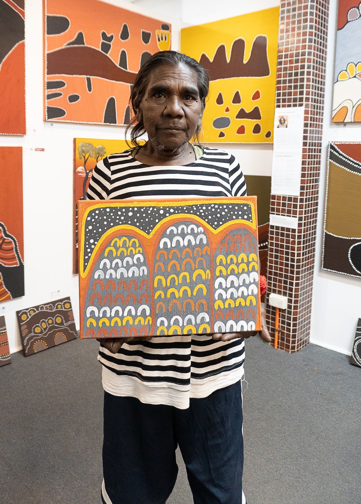 “Somebody have to keep on carrying my painting,” Lena told her. Geraldine paints with permission from her relatives and with a strong sense of purpose: to honour her cultural inheritance, stay connected to her Country, and ensure her knowledge is passed on.