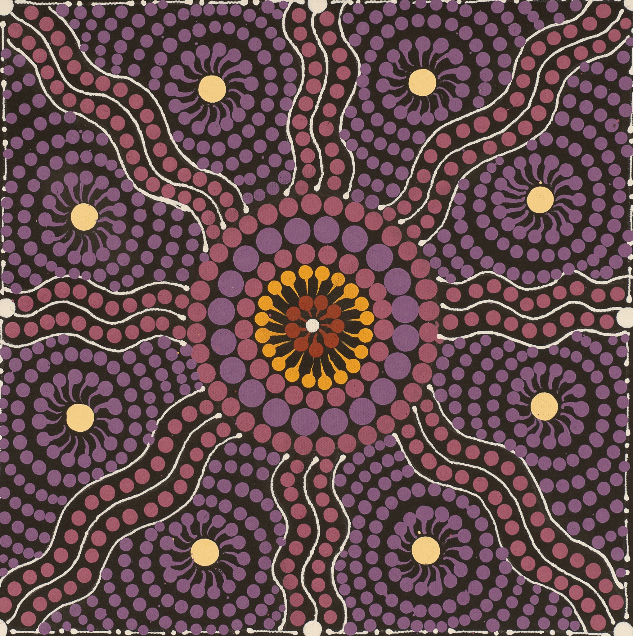 Her Dreaming’s include Women’s Ceremony and Water Dreaming (Ngapa). She also paints artistic depictions of many different bush foods and bush flowers from the area in which she grew up and still resides. These foods are collected by the women, who pass on the knowledge of where to find them during traditional women’s business.