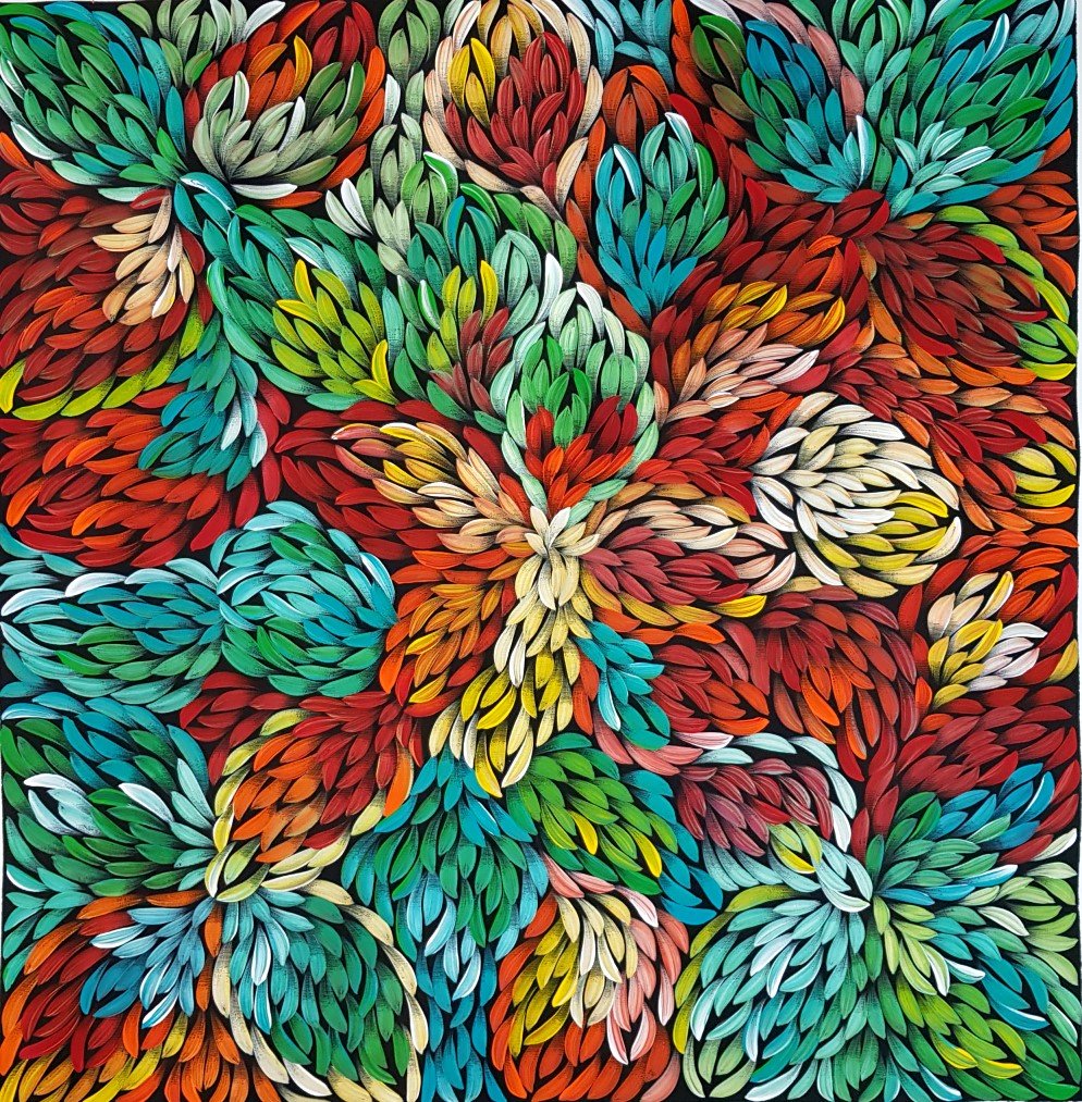 The Bush Medicine Plant is an Australian native that grows wild in Central Australia. Women collect leaves from these plants, which are boiled to extract resin. Kangaroo fat is mixed into the resin, creating a paste that can be stored for a long time in bush conditions. This medicine is used to heal cuts, wounds, bites and rashes. It is also used to treat the flu, headache, backache, upset stomach, chest pains or as an insect repellent. As the leaves and petals dry out they fall off and are blown around by the wind. This is represented in the painting and gives it the movement.