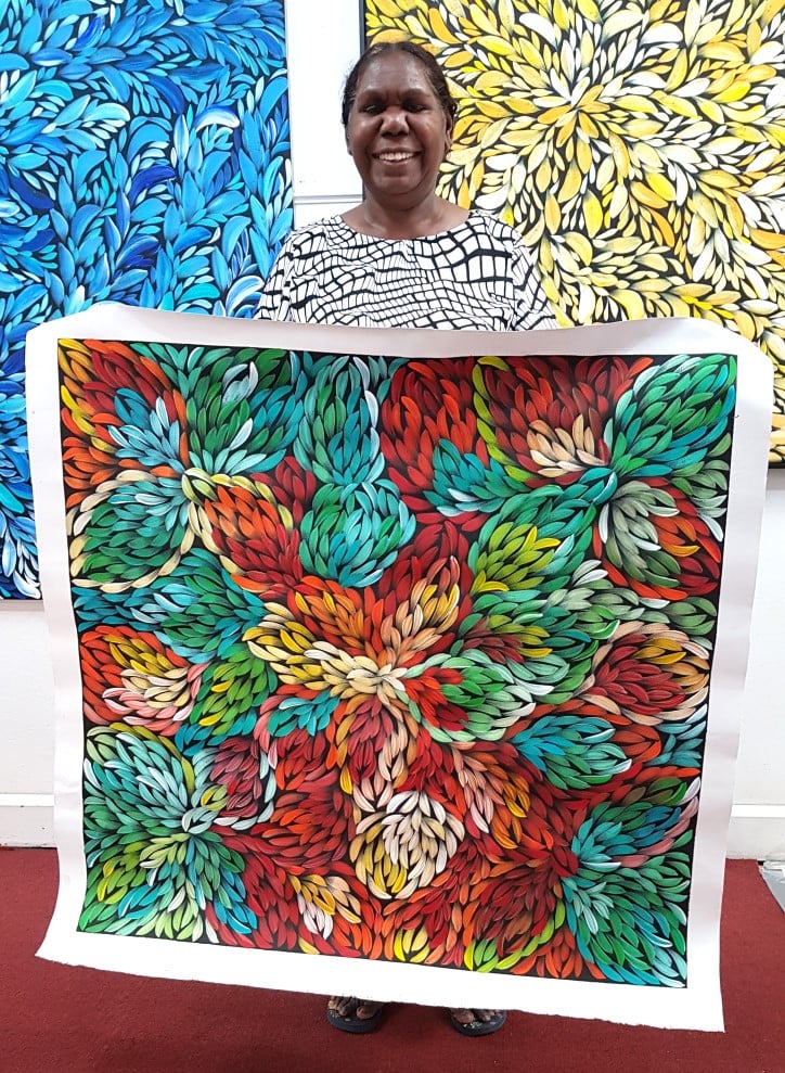 Jacinta paints mainly on canvas but she has also painted artefacts such as shields, coolamons and didgeridoos.