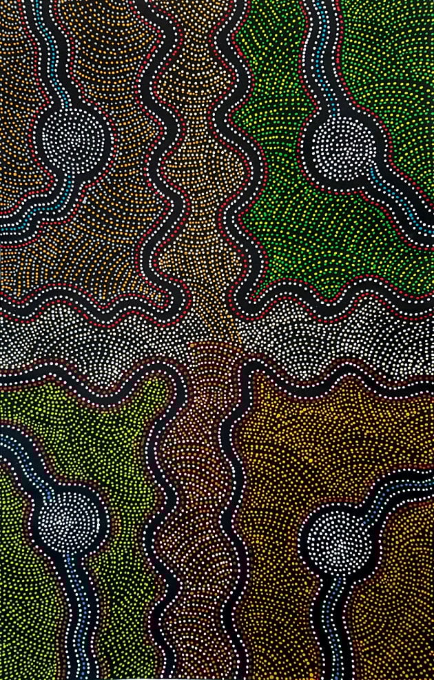 Jacinta paints mainly on canvas but she has also painted artefacts such as shields, coolamons and didgeridoos.