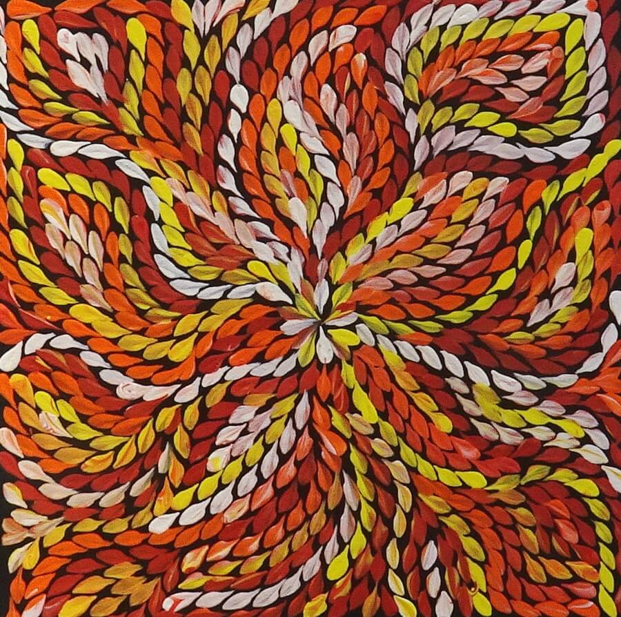 Janet paints the Desert Yam (or Bush Plum) story from her family’s country. The yam grows underground with its viny shrub growing above ground up to one metre high. It is normally found on Spinifex sand plains and produces large flowers after summer rain. The yam is a tuber, or swollen root, of the shrub and tastes much like the common sweet potato. It can be eaten raw or cooked and is still a staple food for the desert aborigines where it can be harvested at any time of the year. It is also renowned for its medicinal properties. This medicine is used to heal cuts, wounds, bites, rashes and as an insect repellent. In this painting, Janet depicts the leaves of the yam paying homage to the spirit of this special plant in the hope that it will regenerate.
