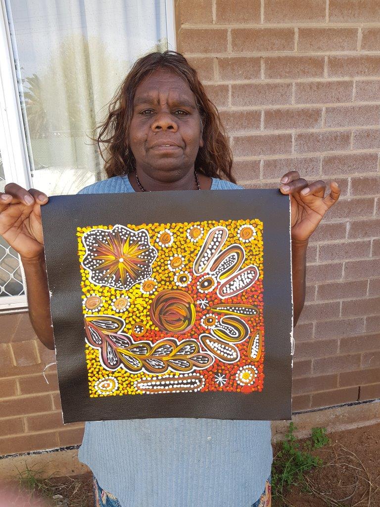 Janet has painted a Women’s Dreaming story, combining her country with the bush tucker and waterholes that are imperative when the women go out bush for ceremony which can take up to a week. The women conduct important ceremonies at these sites, including that of the Desert Yam (or Bush Plum) story from her family’s country.