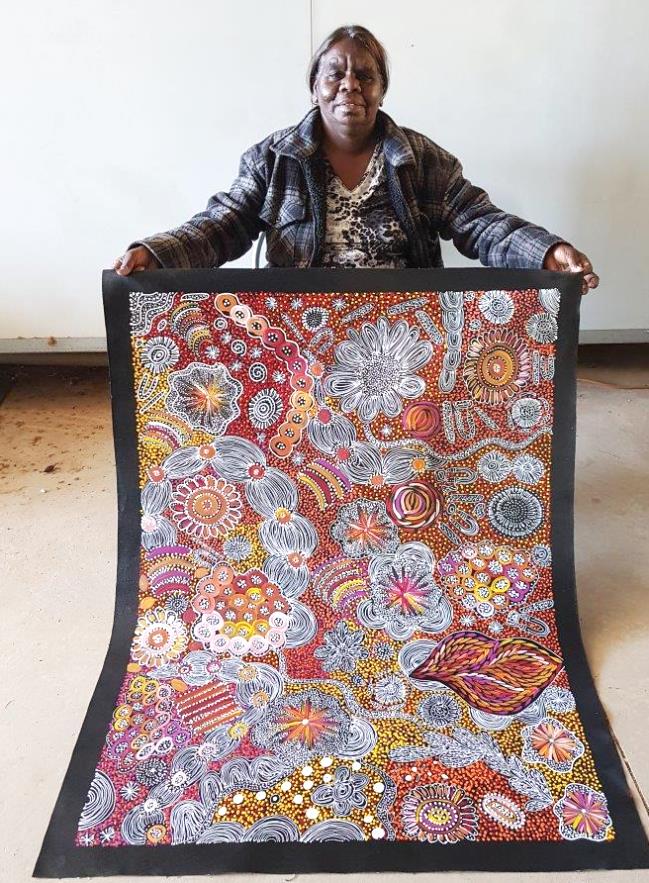 Janet has painted a Women’s Dreaming story, combining her country with the bush tucker and waterholes that are imperative when the women go out bush for ceremony which can take up to a week. The women conduct important ceremonies at these sites, including that of the Desert Yam (or Bush Plum) story from her family’s country.