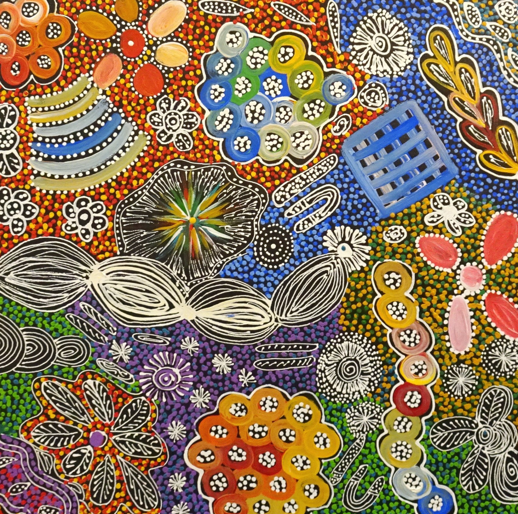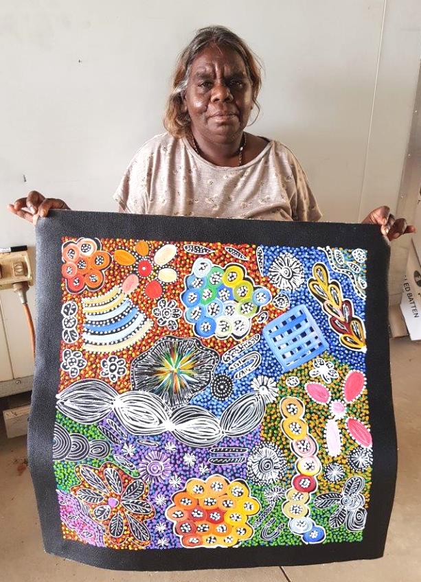 Janet has painted a Women’s Dreaming story, combining her country with the bush tucker and waterholes that are imperative when the women go out bush for ceremony which can take up to a week. The women conduct important ceremonies at these sites, including that of the Desert Yam (or Bush Plum) story from her family’s country.