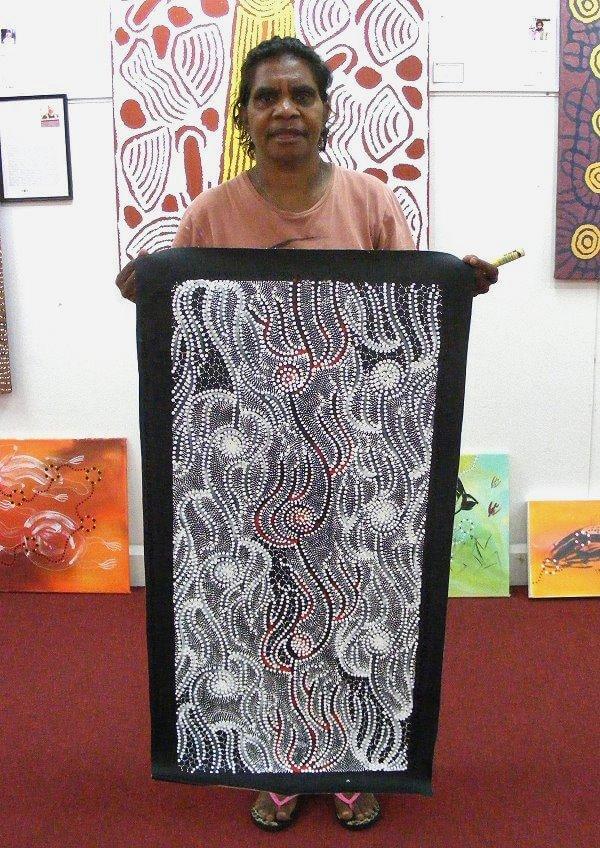 She uses her deep knowledge of her talents as a linguist and translates her Dreamings onto canvas in a way that no other artist is able to achieve. Her paintings have many small details in them that tell a story as a whole. The story that she writes for the paintings is as fascinating as the painting itself. These stories tell of the mythology and religion of her people in a way that any outsider can understand and learn from.