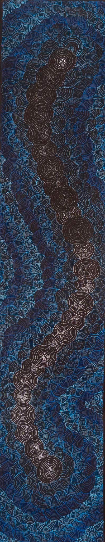 This painting tells the story of a Jangala ‘watiya-warnu’ ancestor who travelled south from a small hill called Ngurlupurranyangu to Yamunturrngu (Mount Liebig). As he travelled he picked the ‘watiya-warnu’ seeds and placed them in ‘parrajas’ (food carriers), one of which he carried on his head. Watiya-warnu is a seed bearing tree that grows in open spinifex or mulga country. When people returned to their camp after collecting the seeds they would make large windbreaks for shelter and winnow the seed in the late afternoon. Immature ‘watiya-warnu’ seed is ground into a paste and can be used to treat upset stomachs. The associated ‘watiya-warnu’ ceremony involves the preparation of a large ground painting. This Jukurrpa belongs to Nampijinpa/Nangala women and Jampijinpa/Jangala men.
