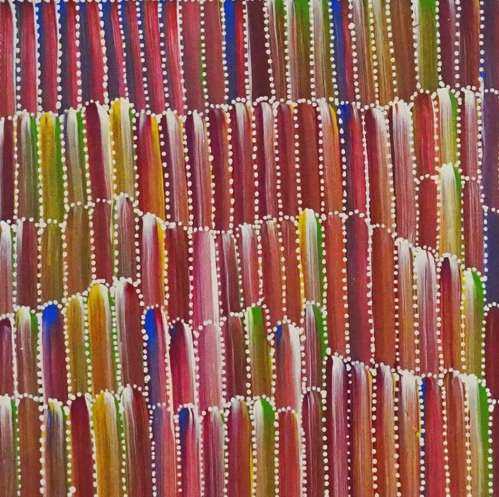 The painting depicts the Bush Yam. The seed of the yam is represented by the fine white dot work and the thick colourful brushwork represents the flower and the vegetable. Jeannie’s style is unique and her palette is bright and bold.