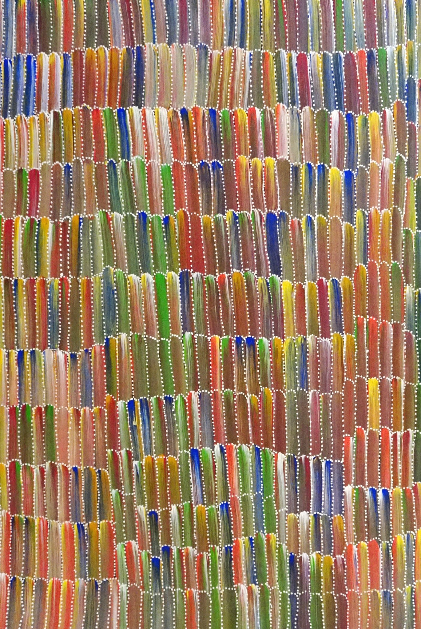 Its bright green leaves and yellow flowers, can spread over quite a wide area, growing strongly until after the rainfall months when it is harvested by digging it out of the ground. By depicting the Yam Dreaming in their paintings, indigenous artists are able to pay homage to this significant plant and encourage its continual rejuvenation.