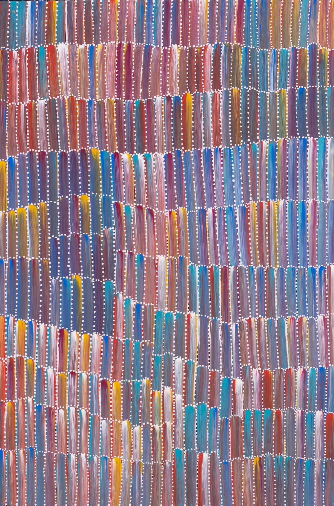 The painting depicts the Bush Yam. The seed of the yam is represented by the fine white dot work and the thick colourful brushwork represents the flower and the vegetable. Jeannie’s style is unique and her palette is bright and bold.