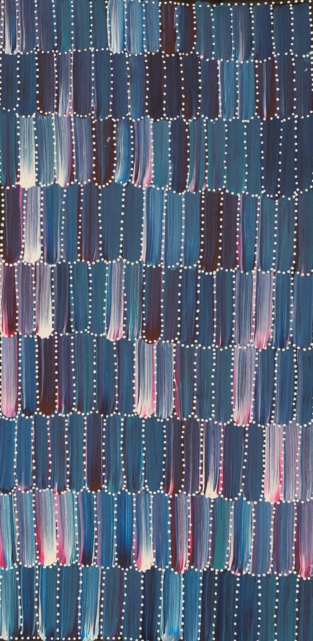The painting depicts the Bush Yam. The seed of the yam is represented by the fine white dot work and the thick colourful brushwork represents the flower and the vegetable. Jeannie’s style is unique and her palette is bright and bold.