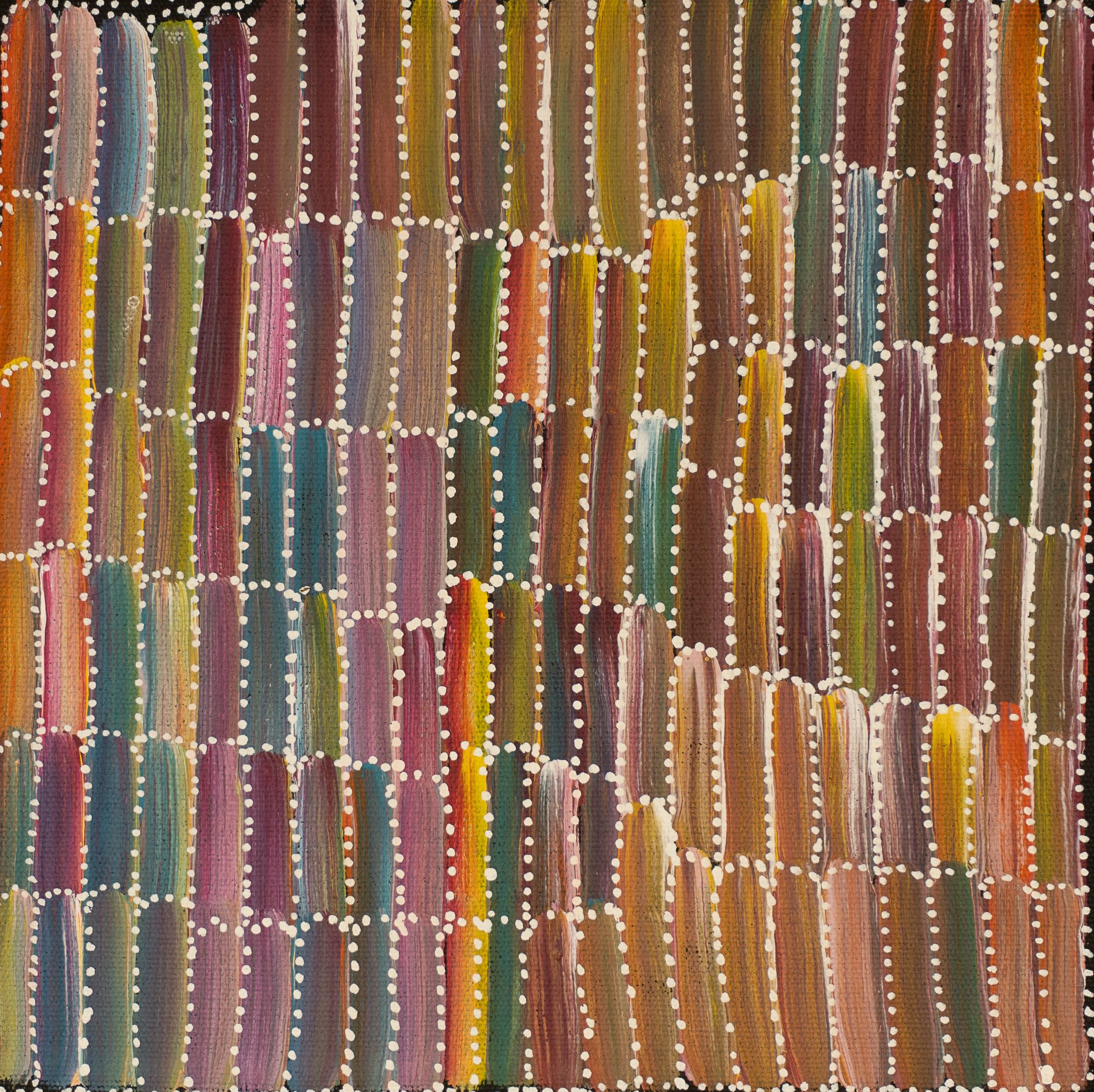 The painting depicts the Bush Yam. The seed of the yam is represented by the fine white dot work and the thick colourful brushwork represents the flower and the vegetable. Jeannie’s style is unique and her palette is bright and bold.