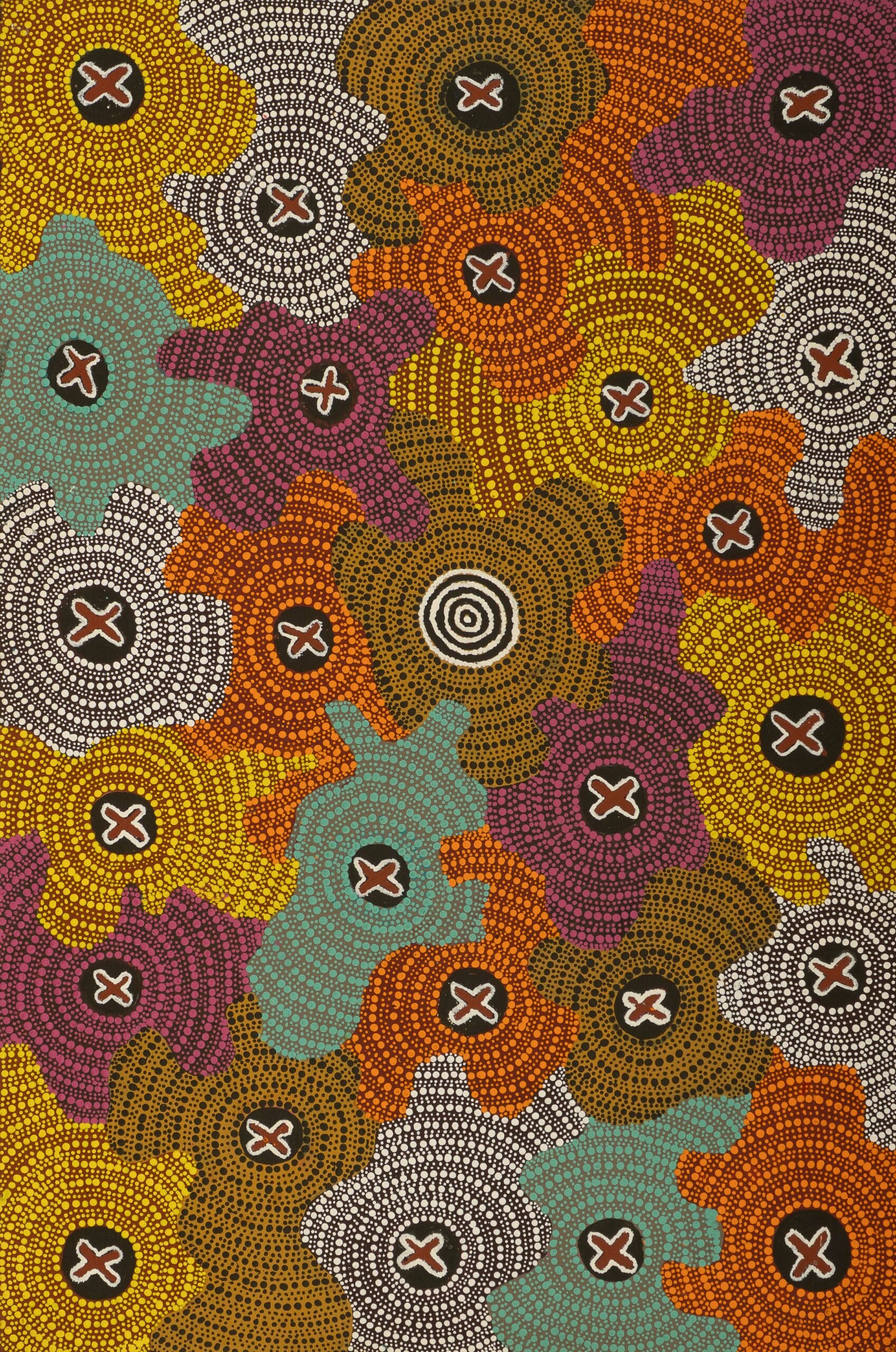 The ‘ngatijirri’ travelled to Yangarnmpi from Patirlirri, near Willowra to the east of Yuendumu and travelled further on to Marngangi, north/west of Mount Dennison and west of Yuendumu. Each time the flock of ancestral ‘ngatijirri’ lands, they perform ceremonies, singing and dancing as they fly and roost in the trees. The sites of these ceremonies are depicted in this painting as concentric circles, while cross-like shapes depict the footprints of the birds on the ground and give an indication of the large flocks of ‘ngatijirri’ that can be found near Yangarnmpi and other sites close to Yuendumu.