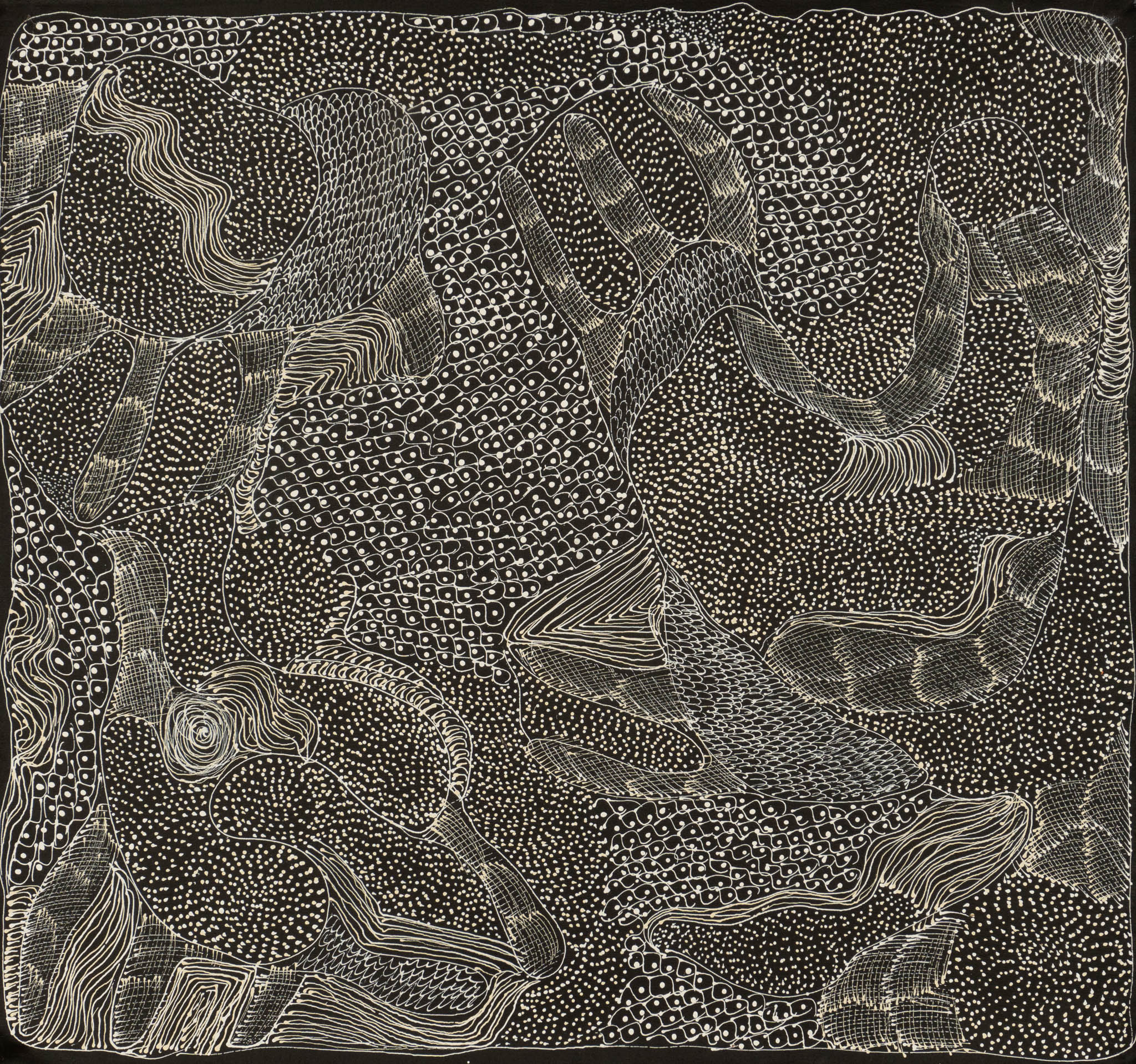 Recently, Jorna has developed a distinctive change in style, with a subtle colour palette of whites, creams and neutrals on a black background. This artwork represents Ngintaka, a giant perentie lizard and creation ancestral being of the Anangu Pitjantjatjara people. The Ngkintaka songline is the major creation story of the Angatja area, and indicates the significant spiritual connection to their lands. Perentie are tracked for long distances and hunted for food.