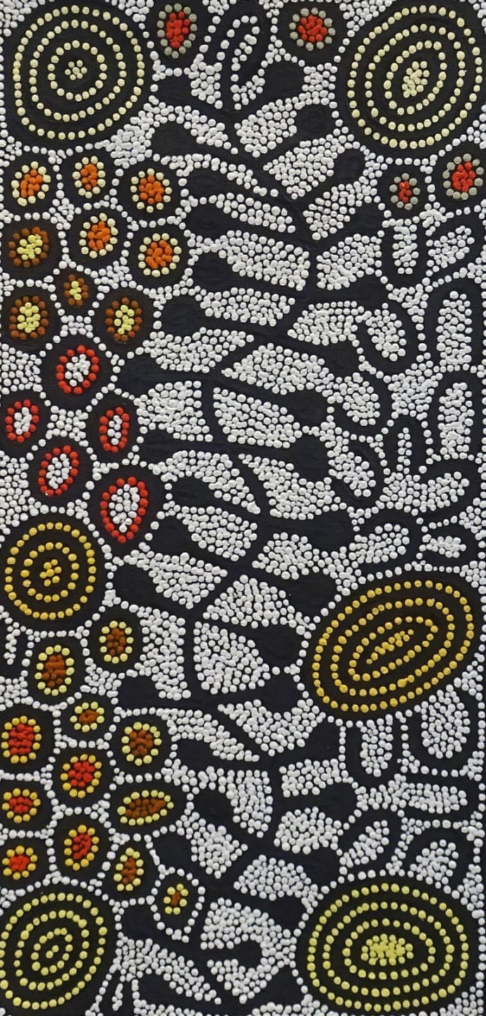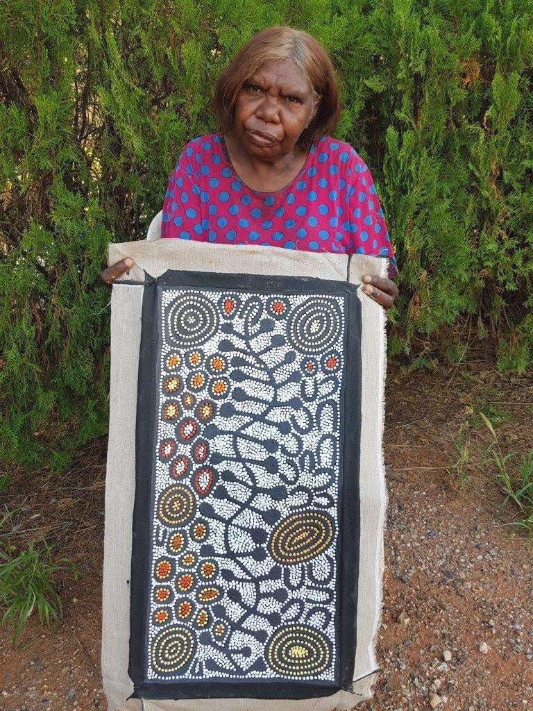 Joylene Reid Napangardi is a Pintupi woman from Tjiturulnga Walungurru (Kintore), and area to the west of Alice Springs. The Pintupi people were the last of the Aboriginal tribes to be located by the European settlers. It is for this reason that many of the designs relate to strong tribal issues that remain important to the Pintupi artists.Coming from an artistic lineage, Joylene’s parents are senior artists Walangkura Napurrula and Kalara Tjapangarti.