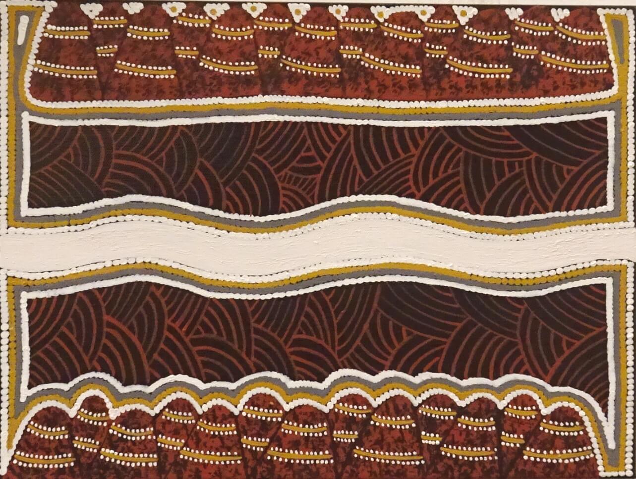 Ju Ju favours detailed subject matter in fine palette ochre – and because of her family connections, the content of her paintings range from the land around Kununurra to Purnululu (Bungle Bungles) and the incredible rock art found in the East Kimberley region.