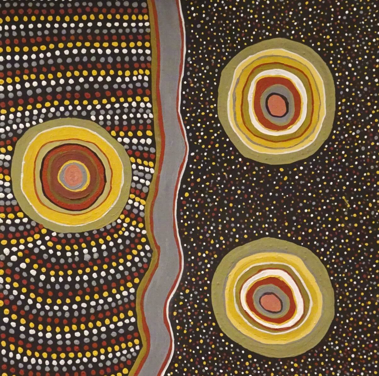 I’ve painted that bush medicine and bush tucker that you find in my mother’s country (Bucket Springs – Binjin in language). There are lots of billabongs that come from the creek overflow especially in the wet season. I’ve painted those billabongs here.